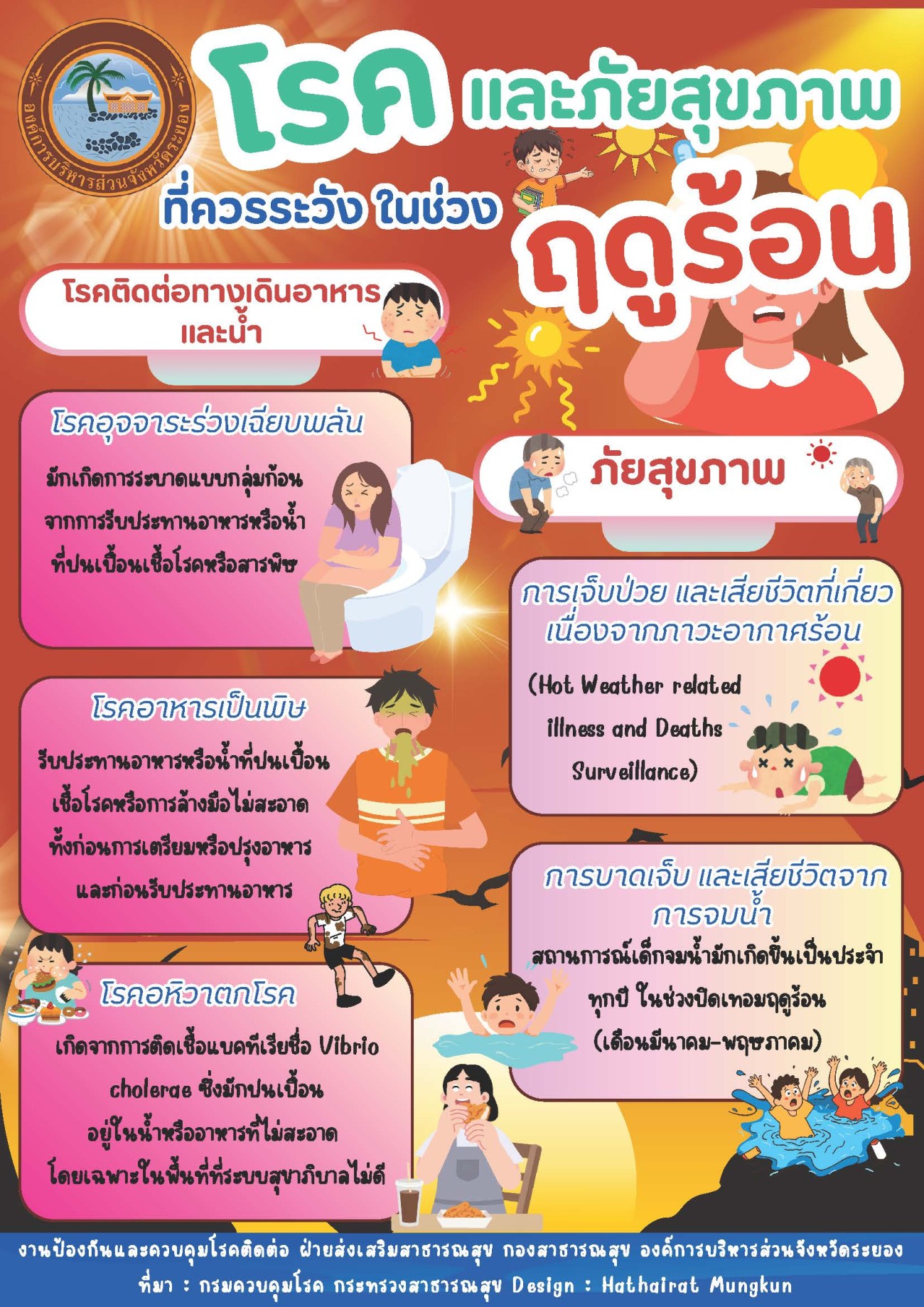 ด้วยกรมควบคุมโรค กระทรวงสาธารณสุข ได้ประกาศว่าขณะนี้เป็นช่วงเวลาที่เข้าสู่ฤดูร้อนของประเทศไทย โดยเริ่มตั้งแต่ปลายเดือนกุมภาพันธ์ไปจนถึงกลางเดือนพฤษภาคม ทำให้สภาพอากาศมีการเปลี่ยนแปลง อากาศที่ร้อนจัดและแห้งแล้งเหมาะแก่การเจริญเติบโตของเชื้อโรคหลายชนิด โดยเฉพาะโรคในระบบทางเดินอาหารและน้ำ ปกติโรคติดต่อทางเดินอาหารและน้ำสามารถเกิดได้ตลอดทั้งปี แต่จะพบมากในช่วงฤดูร้อนซึ่งส่งผลให้อาหารบูดเสียง่ายรวมถึงความแห้งแล้งอาจทำให้เกิดสุขอนามัยที่ไม่เหมาะสม การเปลี่ยนแปลงสภาพอากาศ จึงเป็นสาเหตุที่ทำให้เกิดโรคติดต่อและภัยสุขภาพ กรมควบคุมโรค ในฐานะหน่วยงานที่มีบทบาทภารกิจเกี่ยวกับการเฝ้าระวัง ป้องกัน ควบคุมโรคและภัยคุกคามทางสุขภาพ มีความห่วงใยในสุขภาพของประชาชน หากดูแลสุขภาพอนามัยไม่ถูกต้องหรือไม่หมั่นดูแลร่างกายให้แข็งแรงอยู่เสมอ อาจทำให้เกิดการเจ็บป่วยด้วยโรคติดต่อต่าง ๆ และภัยสุขภาพที่เกิดขึ้นในช่วงฤดูกาลนี้ได้ รายละเอียดปรากฏตามเอกสารที่แนบมาพร้อมนี้