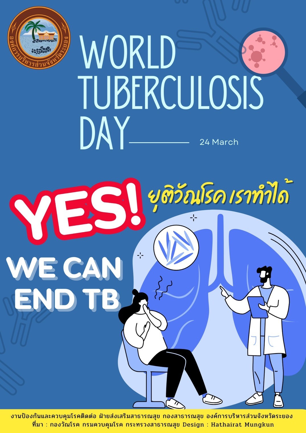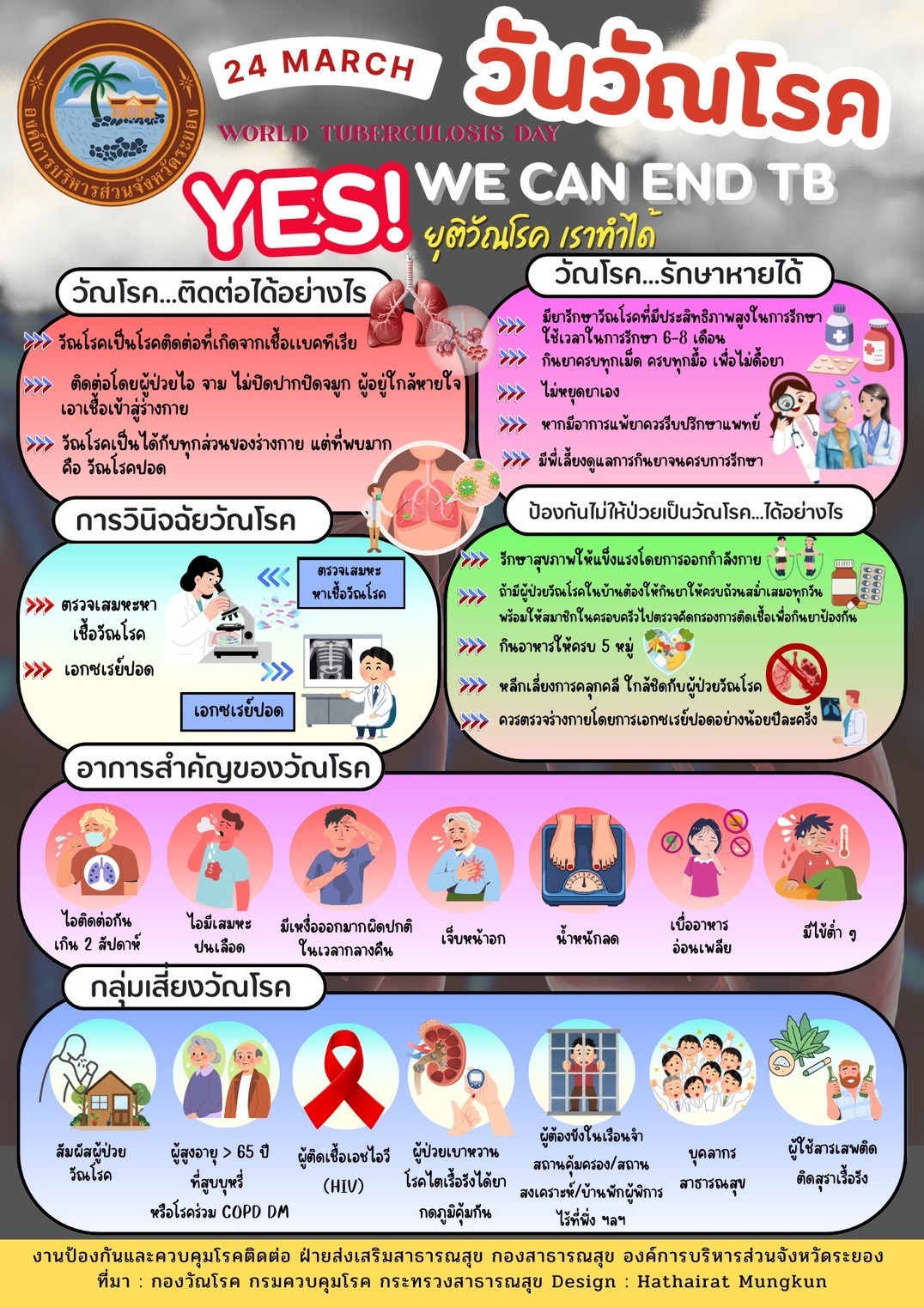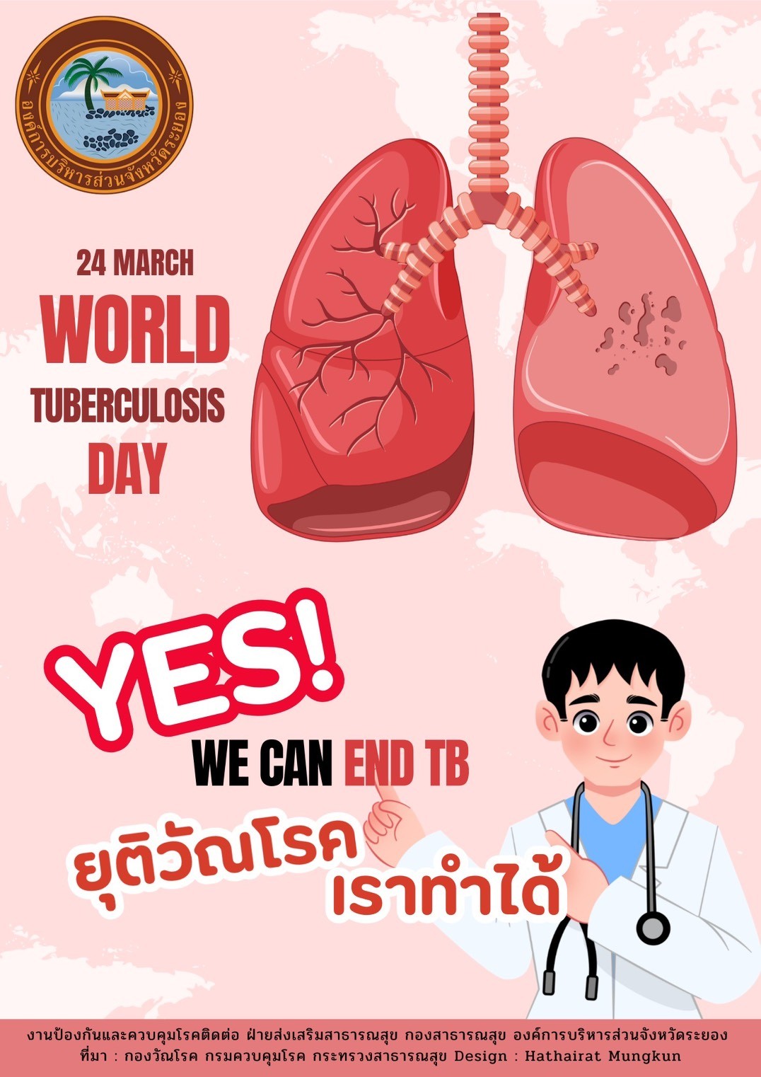 ด้วยองค์การอนามัยโลกกำหนดให้วันที่ ๒๔ มีนาคม ของทุกปี เป็นวันวัณโรคโลก (World Tuberculosis Day) กระทรวงสาธารณสุข โดยกองวัณโรค กรมควบคุมโรค ได้ตระหนักและให้ความสำคัญกับปัญหาวัณโรคมาอย่างต่อเนื่อง พร้อมขับเคลื่อนการดำเนินงานตามแผนปฏิบัติการระดับชาติด้านการต่อต้านวัณโรค เพื่อมุ่งสู่เป้าหมายการพัฒนาที่ยั่งยืน (SDGs) ภายในปี พ.ศ. ๒๕๗๓ และสอดคล้องกับยุทธศาสตร์ยุติวัณโรค (End TB Strategy) ภายในปี พ.ศ. ๒๕๗๘ อันเป็นกรอบทิศทางสำคัญในการลดอุบัติการณ์ การเสียชีวิต และผลกระทบทางสังคมจากวัณโรคอย่างเป็นรูปธรรม ความสำเร็จของการควบคุมวัณโรคจำเป็นต้องอาศัยความร่วมมืออย่าง บูรณาการจากทุกภาคส่วน ทั้งหน่วยงานภาครัฐ ภาคเอกชน สถานบริการสาธารณสุขทุกระดับ ตลอดจนภาคประชาชน การดำเนินกิจกรรมสำคัญ ได้แก่ การค้นหาผู้ป่วยเชิงรุกการรักษาอย่างมีคุณภาพ การส่งต่อที่ต่อเนื่อง และการเผยแพร่ความรู้เกี่ยวกับวัณโรคแก่ผู้ป่วย ครอบครัว และชุมชน ล้วนเป็นกลไกหลักในการเสริมสร้างความเข้าใจและการมีส่วนร่วมอย่างยั่งยืน ดังนั้น การปฏิบัติงานต้องเป็นไปตามมาตรฐานของแผนการดำเนินงาน