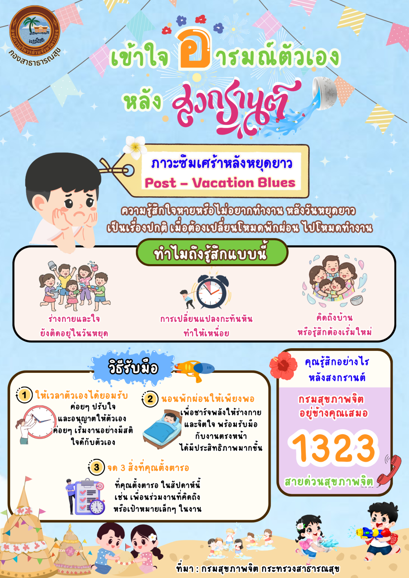 ด้วยกองสาธารณสุข ได้จัดทำสื่อประชาสัมพันธ์สุขภาพจิต “เข้าใจอารมณ์หลังสงกรานต์” เพื่อประชาสัมพันธ์ให้บุคลากรในสังกัดองค์การบริหารส่วนจังหวัดระยอง นักเรียน นักศึกษา และประชาชนทั่วไป ได้ตระหนักถึงความสำคัญในการเข้าใจอารมณ์ซึมเศร้าที่จะเกิดขึ้นหลังวันหยุดยาว และเพื่อรับมือกับอารมณ์เศร้า หมดแรง และรู้สึกไม่สบายใจ เมื่อต้องกลับไปสู่ชีวิตประจำวัน หลังจากผ่านช่วงเวลาแห่งความสุขในวันหยุดยาว สิ่งสำคัญที่ต้องเข้าใจคือภาวะนี้ไม่ใช่โรคทางจิตเวช แต่เป็นอาการปรับตัวทางอารมณ์ที่เกิดขึ้นชั่วคราว ซึ่งสภาวะอารมณ์ด้านลบที่เกิดขึ้นหลังวันหยุดยาวบางคนอาจรู้สึกถึงภาวะซึมเศร้าหลังวันหยุดยาวได้เพียงเล็กน้อย แต่บางคนอาจมีอาการรุนแรงจนกระทบต่อการทำงานและชีวิตประจำวัน ทั้งนี้ ภาวะซึมเศร้าหลังวันหยุดยาว จะไม่ใช่โรคทางจิตเวช แต่หากอาการไม่ดีขึ้นภายใน ๒ สัปดาห์ หรือมีอาการรุนแรงขึ้น ควรปรึกษาจิตแพทย์ หรือนักจิตวิทยาต่อไปรายละเอียดตามเอกสารที่แนบมาพร้อมนี้