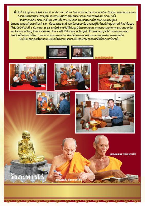 วันพฤหัสบดีที่ 14 พฤศจิกายน 2562 เวลา 15.59 นาฬิกามูลนิธิสถาบันพระมหาชนก องค์การบริหารส่วนจังหวัดระยอง เปิดจองเหรียญบาตรน้ำมนต์หลวงปู่ทิม รุ่นหอเฉลิมพระเกียรติ ร. 9 เป็นวันแรก ปรากฎว่า มีผู้ใจบุญ ร่วมจองเหรียญและจ่ายเงินเต็มจำนวนแล้ว จำนวน 3 ราย ขอบุญกุศลในการร่วมบุญครั้งนี้ จงดลบันดาลประทานพรให้ท่านและครอบครัว เจริญด้วยอายุ วรรณะ สุขะ พละ และลาภยศ สรรเสริญ ด้วยเทอญ. สาธุๆโดยรายได้จากการบูชาเหรียญทั้งหมด องค์การบริหารส่วนจังหวัดระยอง จะนำไปสบทบทุน”มูลนิธิสถาบันพระมหาชนก” และบำรุงรักษาหอเฉลิมพระเกียรติ ร. 9 อ่างเก็บน้ำดอกกราย อ.ปลวกแดง จ.ระยอง ให้เป็นแหล่งศึกษาเรียนรู้ศาสตร์พระราชา สู่การพัฒนาที่ยั่งยืน สืบสาน รักษา และต่อยอด ของประชาชนชาวไทยและอนุชนคนรุ่นหลังตลอดกาลนาน จึงขอเชิญชวนทุกท่านร่วมบุญมหากุศลครั้งยิ่งใหญ่ ด้วยการบูชาเหรียญนี้ ถวายเป็นพระราชกุศลแด่ในหลวงรัชกาลที่ 9