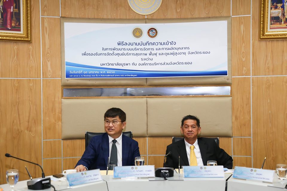 พิธีลงนามบันทึกความเข้าใจ (MOU) ระหว่างองค์การบริหารส่วนจังหวัดระยอง และ มหาวิทยาลัยบูรพาร่วมมือพัฒนาระบบบริหารจัดการ และการผลิตบุคลากรเพื่อรองรับการจัดตั้งศูนย์บริการสุขภาพ ฟื้นฟู และดูแลผู้สูงอายุ จังหวัดระยอง