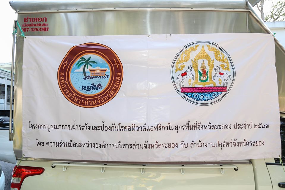 วันที่ 13 กุมภาพันธ์ 2563 เวลา 14.00 น. ณ องค์การบริหารส่วนจังหวัดระยองนายปิยะ ปิตุเตชะ นายกองค์การบริหารส่วนจังหวัดระยอง นายศุภศักดิ์ ผุดผ่อง รองนายก อบจ.ระยอง (2) นายแพทย์ไชยวัฒน์ จตุพร เลขานุการนายก อบจ.ระยอง นางจีรกิต อิศรวิชิตชัยกุล หัวหน้าสำนักปลัด อบจ.ระยอง ร่วมกันมอบผลิตภัณฑ์เคมีฆ่าเชื้อควบคุมโรคอหิวาต์แอฟริกาในสุกร จำนวน 100 ถัง ให้กับ นายรัตนไกร ตันศรีวงษ์ ปศุสัตว์จังหวัดระยอง สืบเนื่องจากขณะนี้สถานการณ์โรคอหิวาต์แอฟริกาในสุกรยังมีการแพร่ระบาดอย่างต่อเนื่องในหลายประเทศ องค์การบริหารส่วนจังหวัดระยองจึงได้จัดทำ(MOU) โครงการบูรณาการเฝ้าระวังและป้องกันโรคอหิวาต์แอฟริกาในสุกรพื้นที่จังหวัดระยอง ร่วมกับ ปศุสัตว์จังหวัดระยอง โดยจัดสรรงบประมาณสนับสนุนในการจัดซื้อผลิตภัณฑ์เคมีฆ่าเชื้อควบคุมโรคอหิวาต์แอฟริกาในสุกร เพื่อป้องกันและควบคุมการแพร่ระบาดของโรคในเขตพื้นที่จังหวัดระยอง ซึ่งจังหวัดระยองยังไม่มีรายงานการเกิดโรคระบาด
