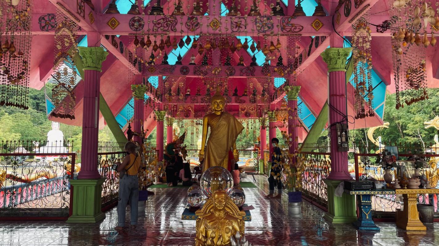 เราไปดูอีกฝั่งของถนนกันบ้าง เมื่อเดินมาที่ฝั่งซ้าย จะมีศาลากลางน้ำสีสันสวยงามสะดุดตามาก เป็นศาลาสีชมพู