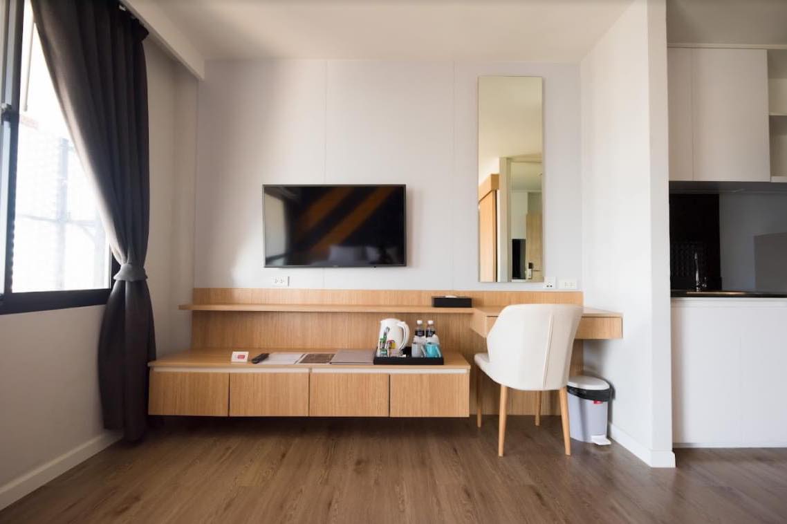 ให้ความเป็นส่วนตัวสุดๆ มีอุปกรณ์ครบครันทั้งเครื่องปรับอากาศ โทรทัศน์ ตู้เย็น กาต้มน้ำ ฝักบัว เครื่องเป่าผม โต๊ะทำงาน โซฟา