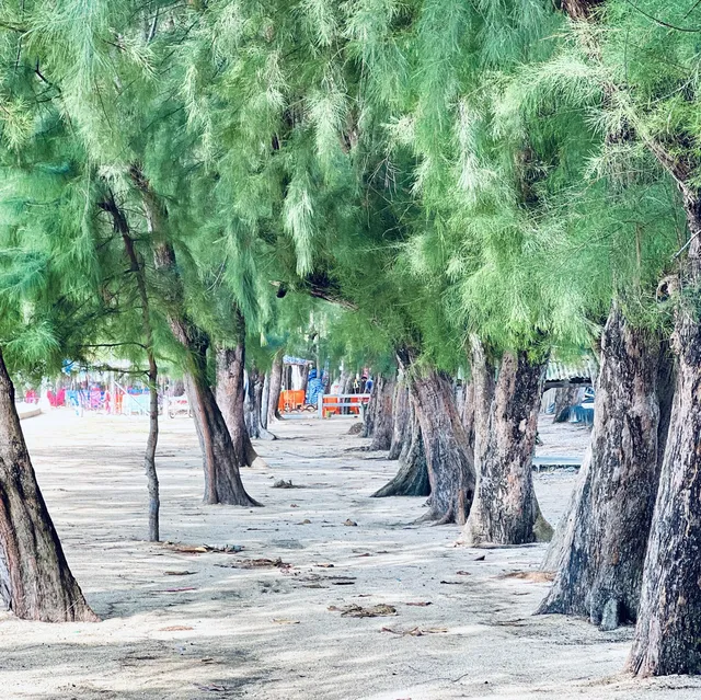รอบชายหาดจะมีต้นสนเป็นแนวยาว ใต้ร่มเงาสนมีบริการซุ้มที่นั่งริมทะเล เตียงผ้าใบ หรือจะนำเสื่อมาปู