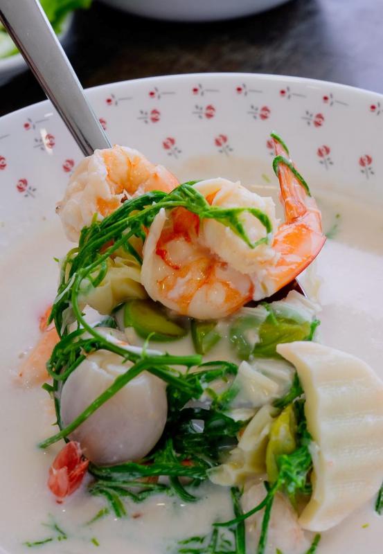 และยังมีเมนู “กุ้งต้มกะทิ”กุ้งตัวใหญ่ๆต้มกะทิมีหน่อไม้และสตอ เป็นทีเด็ดของทางร้านมาลองทานกันนะคะ