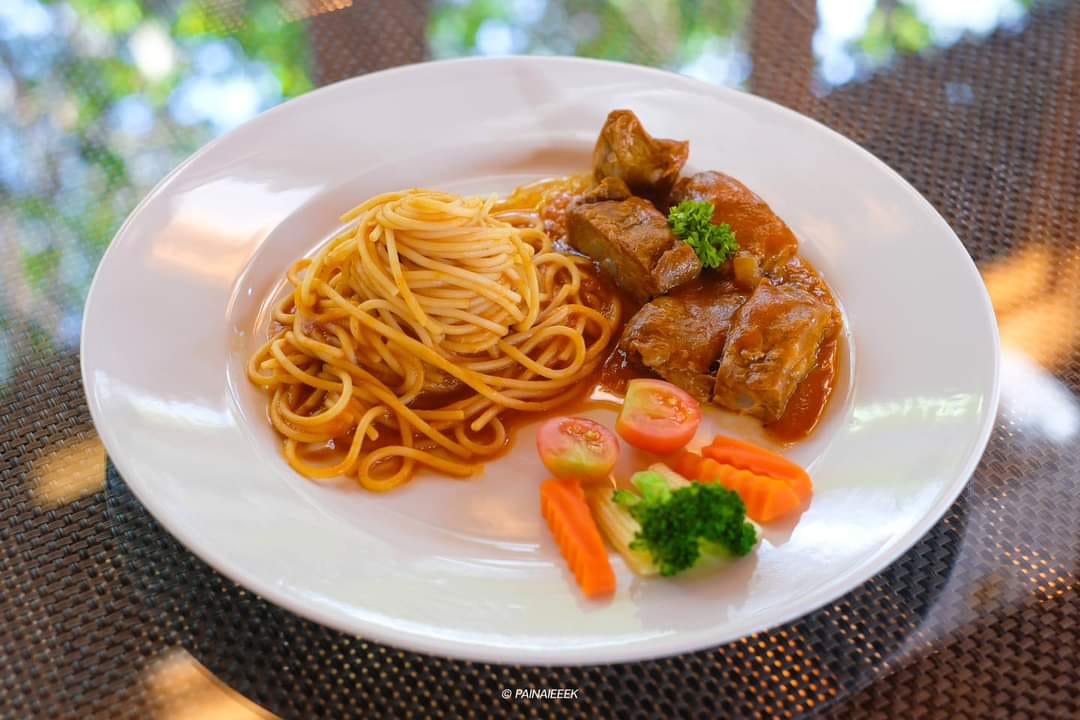 อาหารทานเล่น สลัด สเต็ก สปาเก็ตตี้ หรือเมนูอาหารพื้นบ้านก็มีค่ะ รสชาติอาหารอร่อยถูกปาก