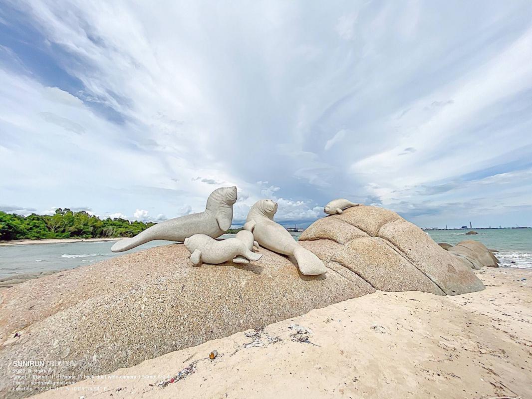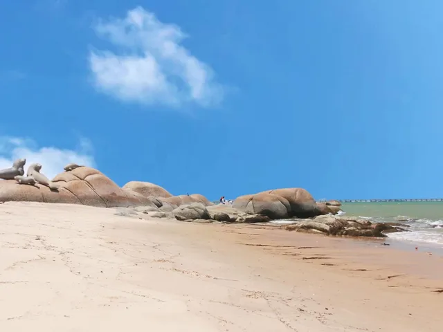 และเงียบสงบ เหมาะกับการเล่นน้ำและพักผ่อนเป็นที่สุด ที่บริเวณปลายหาดจะมีรูปปั้นปลาพะยูนอยู่บนหิน