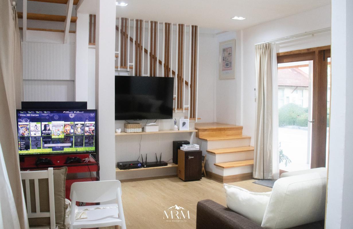 โทนสีขาว ดูดี มีพื้นที่กว้างขวาง เข้าพักได้ถึง 15 คน ภายในบ้านมีห้องนั่งเล่น มีตู้เกมส์สำหรับ