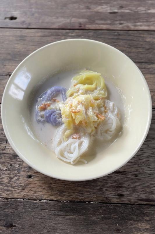 เป็นขนมจีนเส้นสด หลากสีสันสัน ทั้งเหลืองขมิ้น ม่วงอัญชัน