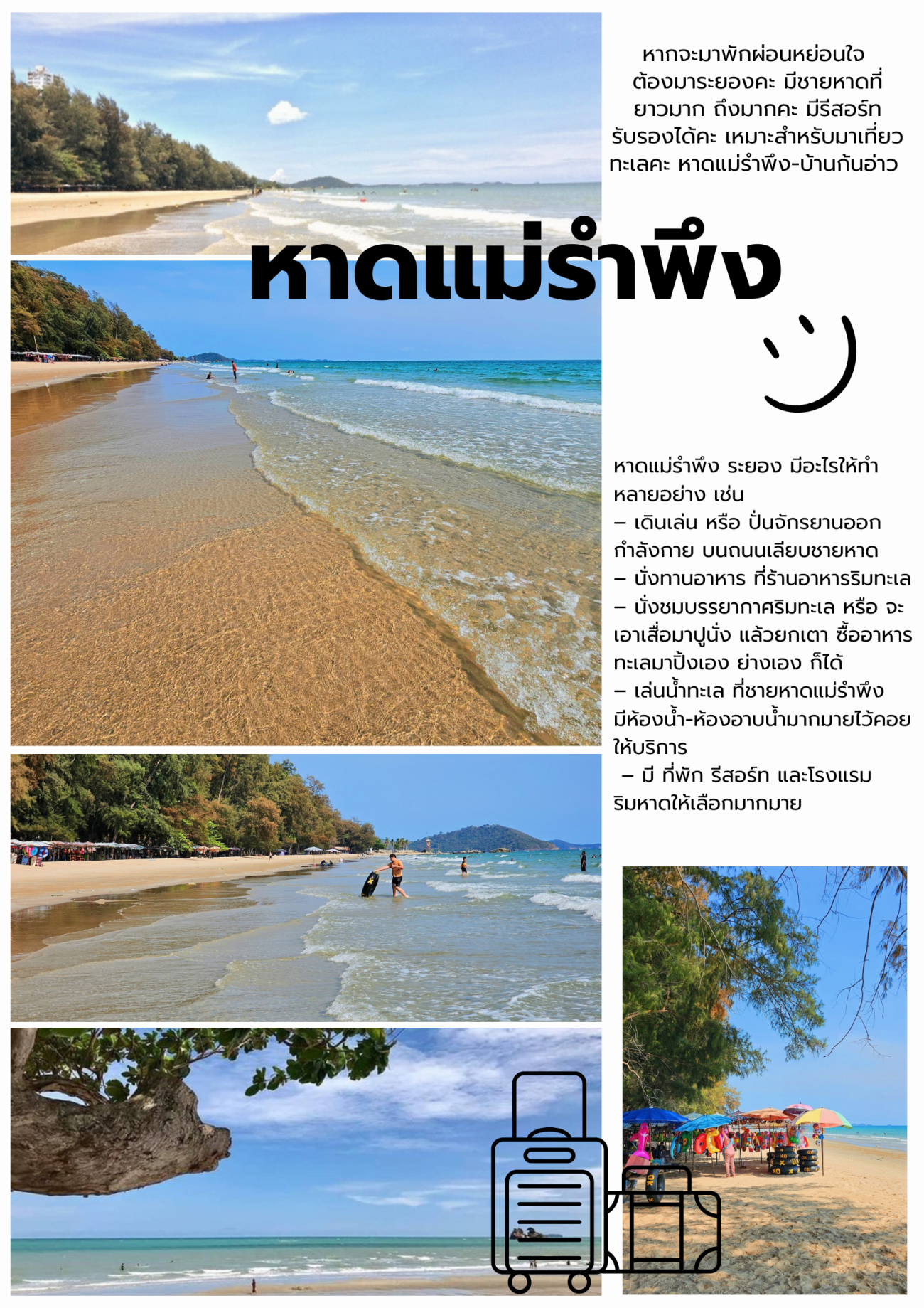 หากจะมาพักผ่อนหย่อนใจ ต้องมาระยองค่ะ มีชายหาดที่ยาวมาก ชายหาดมีความยาว 12 กิโลเมตร ถนนเลียบชายหาดยาว 10 กิโลเมตร มีที่พักและร้านอาหารมากมาย ใครที่มาระยอง อย่าลืมแวะมาเที่ยวหาดแม่รำพึงกันค่ะ