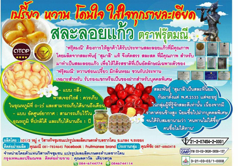 สละลอยแก้วฟรุ้ตมณี หวานน้อย ใช้ผลผลิตจากสวนที่ผ่านการดูแลด้วยผู้เชี่ยวชาญมาเป็นอย่างดี โดยสายพันธุ์สละที่นำมาใช้คือ สละสุมาลีแท้100%ผ่านกระบวนการผลิตที่ได้รับมาตรฐานการผลิต ทั้ง GMPและฮาลาล เป็นสละไร้เมล็ดที่มี รสชาติเปรี้ยวหวาน โดนใจ ใส่ใจทุกรายละเอียด เหมาะสำหรับผู้บริโภคทุกเพศทุกวัย สามารถรับประทานได้ทุกที่ทุกเวลา