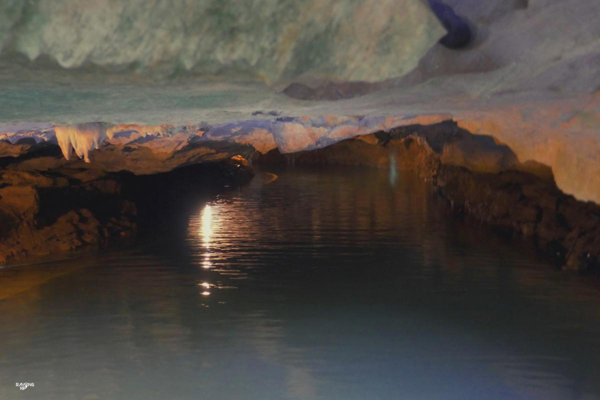 จากการสำรวจสัมผัสได้ถึงบรรยากาศที่เงียบสงบ มีความสดชื่น มันจะเย็นๆ ชื้นๆ หน่อย ด้านหน้าจะมีพระพุทธรูปขนาดใหญ่ ส่วนด้านข้างจะมีถ้ำเล็กๆ ที่ประดิษฐานพระพุทธรูปอีกหลายองค์ให้ประชาชนได้สักการะขอพร ถัดมาจะเป็นอุโมงค์บาดาลที่เชื่อมต่อไปยังอีกฝั่งซึ่งเราต้องนั่งเรือเข้าไป งานนี้ถ้าพายเองคงล่มแน่ๆ โชคดีที่วันนี้มีน้องเป้งอาสาพาเข้าไปชมความสวยงามด้านใน โดยน้องเป้งไม่ได้นั่งพายเรืออย่างที่คิดไว้ แต่ใช้วิธีการไสหรือดันเรือเข้าไป เพราะน้ำไม่ลึกมากแค่ระดับอกน้องเป้งเอ๊ง! น้ำนี่อย่างเย็นเล่นเอาคนไสเรือเราตัวสั่นเลยทีเดียว ระหว่างทางที่เข้าไปในอุโมงค์จะเห็นหินธรรมชาติที่ถูกกัดกร่อนมีรูพรุนเล็กใหญ่สลับกันไป เนื่องจากระดับน้ำสูงไม่มากแม้…ฉันกลัวที่แคบ ก็สามารถลุยต่อได้สบาย แต่บางช่วงต้องยอมก้มหัวให้หินนิดนึง ไม่งั้นเดี๋ยวโป๊กขึ้นมาละแย่เลย มีคนเล่าว่าอุโมงค์นี้พระ เณร เด็กวัดและชาวบ้านต้องช่วยกันขุดและขนดินออก กว่าจะทะลุถึงถ้ำอีกฝั่งหนึ่งได้ต้องใช้ความพยายามอย่างมากมาย ล่องเรืออยู่ไม่นานน่าจะระยะทางเกือบ 300 เมตร ก็มาถึงฝั่งด้านใน ซึ่งมีลักษณ์เป็นหุบผา มีลานกว้างมองเห็นต้นไม้และท้องฟ้า ซึ่งมีการปรับพื้นที่ให้ดูสะอาด กลมกลืนกับธรรมชาติ ด้านในจะมีถ้ำเล็กๆ ที่ใช้สำหรับใช้ปฏิบัติธรรม รู้สึกว้าว! ทันทีเมื่อได้มายืนมองถ้ำ เพราะเต็มไปด้วยหินง้อยหินยอก เอ้ย! หินงอกหินย้อย และอากาศไม่อับชื้นมาก มีค้างคาวบินมาทักทายนิดหน่อยนับได้ 4 – 5 ตัว ในถ้ำทางวัดจะติดไฟไว้ระหว่างทางซึ่งเราสามารถมองด้วยตาเปล่าโดยไม่ต้องพึ่งไฟฉาย ที่นี่อากาศดีเย็นสบาย โดยเฉพาะหุบฝาที่มีความเขียวขจีของต้นไม้สลับกับหินที่ดูสบายตา กลับมาที่ด้านนอกยังมีลิงและบ่อเลี้ยงปลาให้ได้ชมกันอีกด้วย