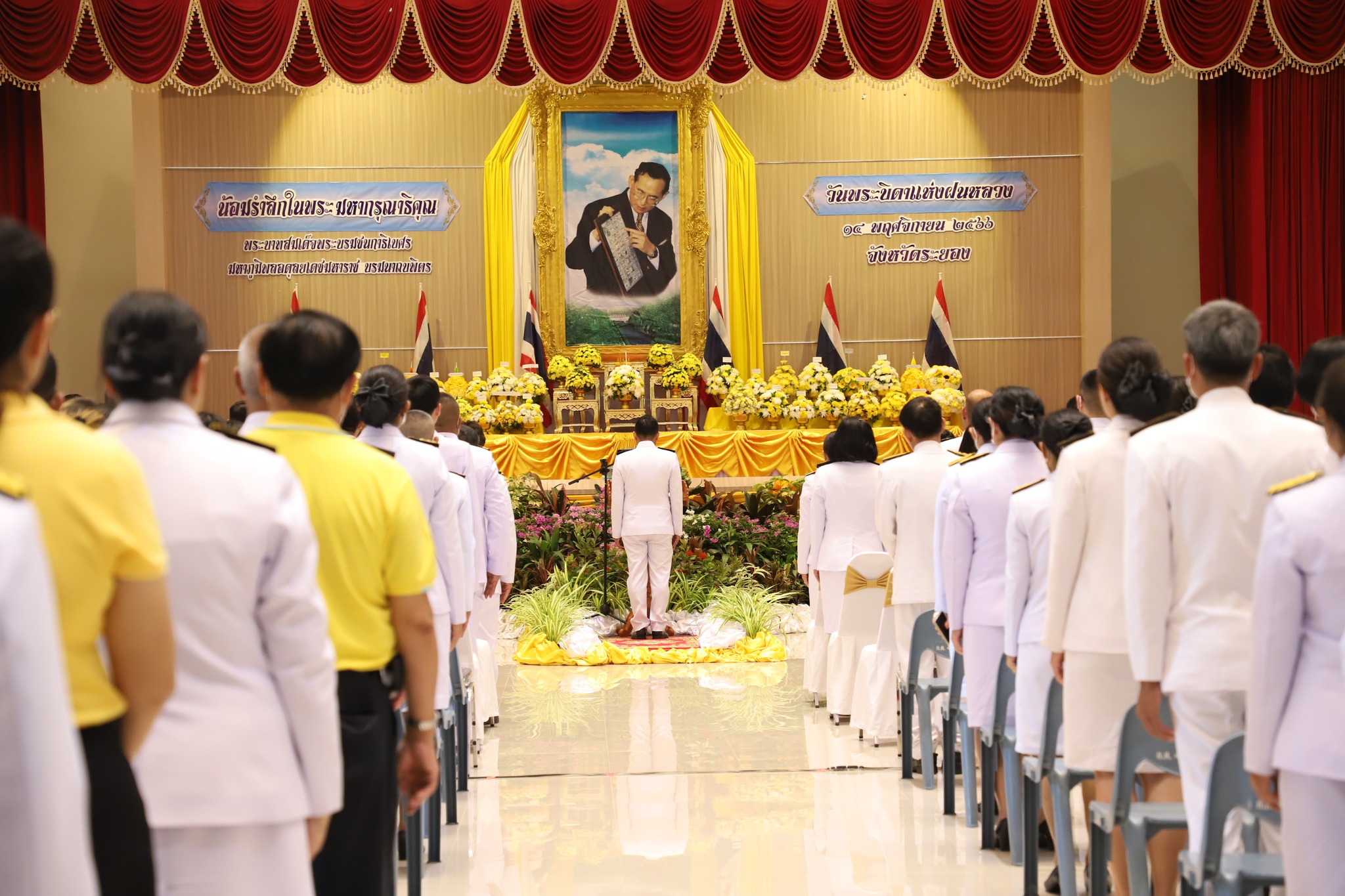 วันที่ 14 พฤศจิกายน 2566 เวลา 08.00 น. องค์การบริหารส่วนจังหวัดระยอง นำโดยนายสมบัติ มุมทอง หัวหน้าสำนักปลัดองค์การบริหารส่วนจังหวัด พร้อมด้วยข้าราชการอบจ.ระยอง เข้าร่วมพิธีวางพานพุ่มดอกไม้สดถวายราชสักการะเนื่องในวันพระบิดาแห่งฝนหลวง ประจำปี 2566 โดยกำหนดให้วันที่ 14 พฤศจิกายน ของทุกปี เป็นวันบิดาแห่งฝนหลวง เพื่อจารึกไว้ในประวัติศาสตร์ของชาติไทย ให้ประชาชนและอนุชนรุ่นหลังได้มีโอกาสแสดงความจงรักภักดี และน้อมรำลึกในพระมหากรุณาธิคุณของพระบาทสมเด็จพระบรมชนกาธิเบศร มหาภูมิพลอดุลยเดชมหาราช บรมนาถบพิตร ณ หอประชุมใหญ่ศูนย์ราชการจังหวัดระยอง อำเภอเมืองระยอง จังหวัดระยอง