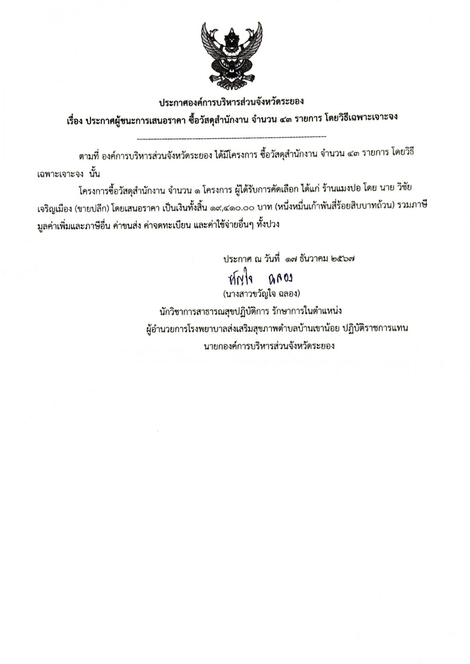 ประกาศผู้ชนะการเสนอราคา ซื้อวัสดุสำนักงาน จำนวน 43 รายการ โดยวิธีเฉพาะเจาะจง