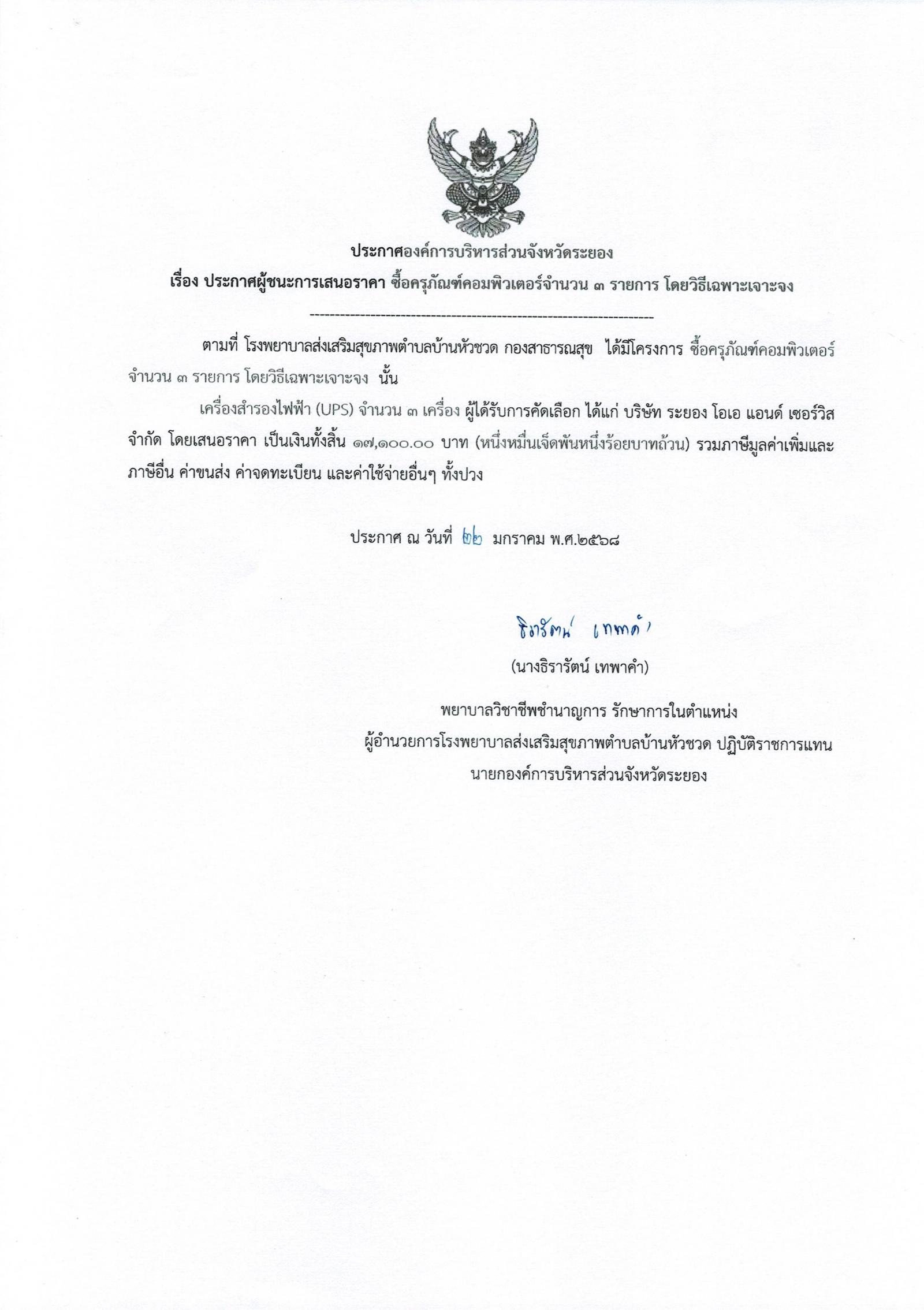 ประกาศผู้ชนะการเสนอราคา ซื้อครุภัณฑ์คอมพิวเตอร์ จำนวน 3 รายการ โดยวิธีเฉพาะเจาะจง
