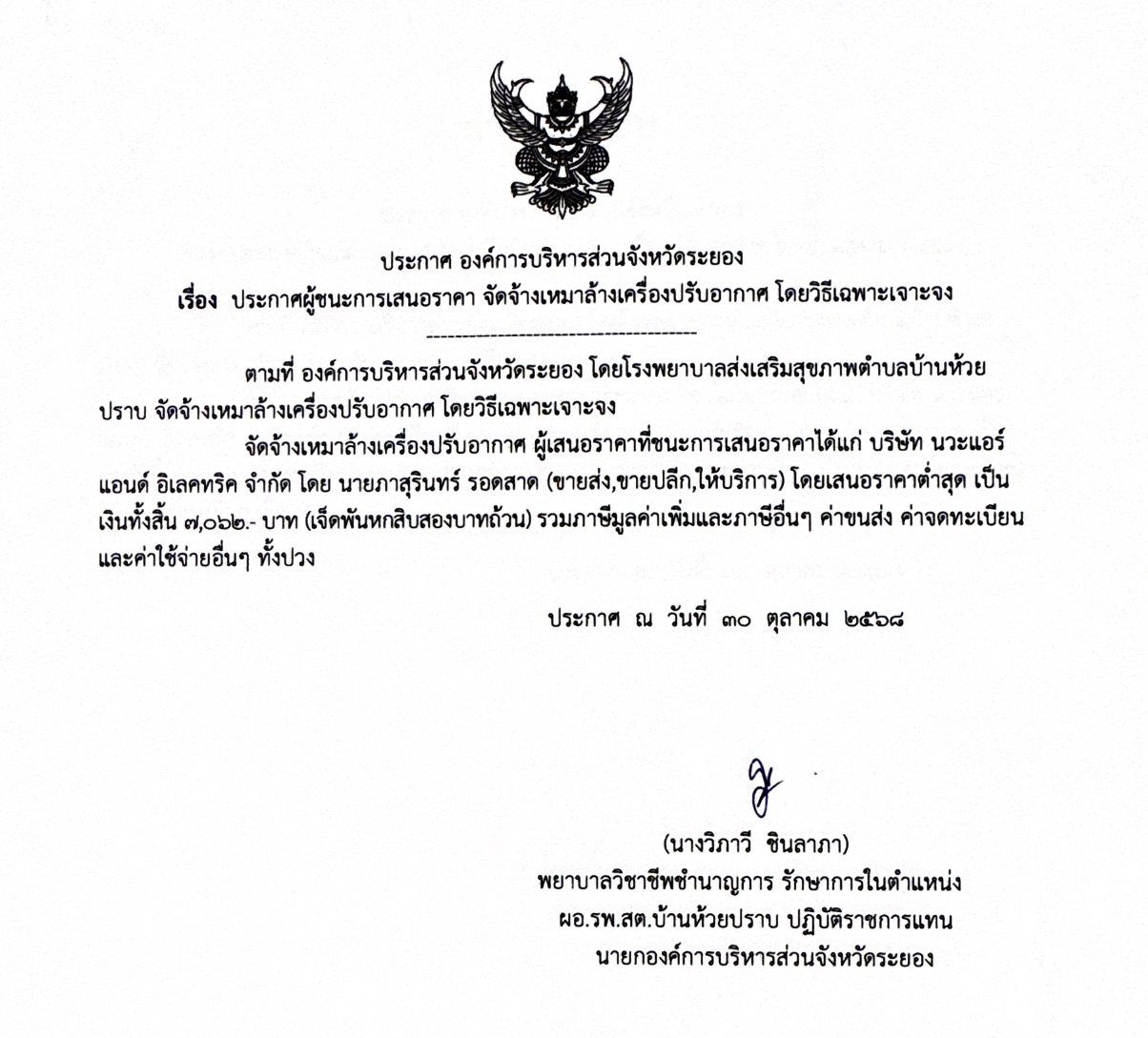 ประกาศ องค์การบริหารส่วนจังหวัดระยอง