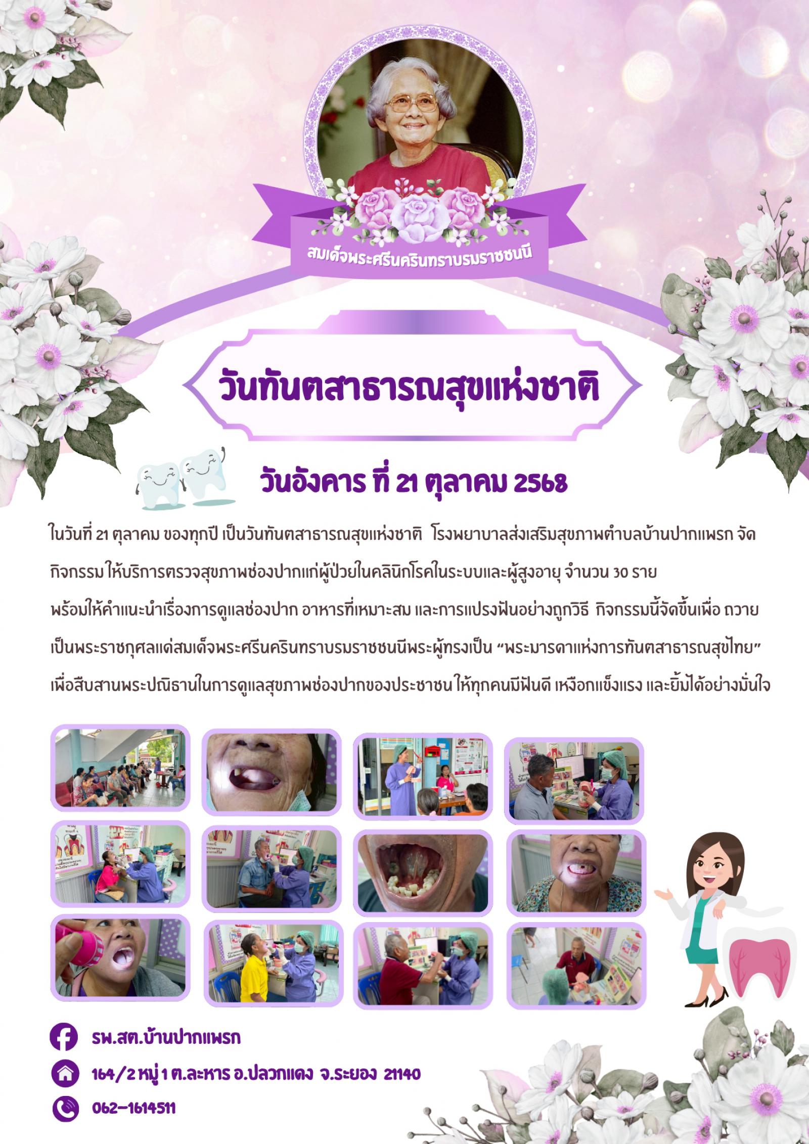 วันที่ 21 ตุลาคม 2568 "วันทันตสาธารณสุขแห่งชาติ" รพ.สต.บ้านปากแพรก จัดกิจกรรมให้บริการตรวจสุขภาพช่องปากแก่ผู้ป่วย จำนวน 30 ราย
