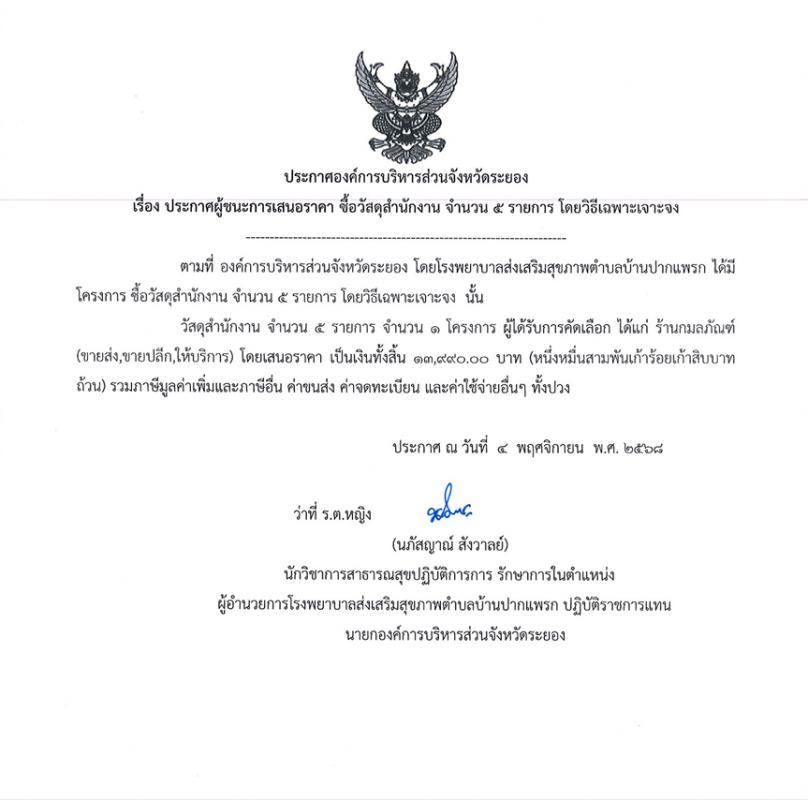 ประกาศผู้ชนะการเสนอราคา ซื้อวัสดุสำนักงาน จำนวน 5 รายการ โดยวิธีเฉพาะเจาะจง