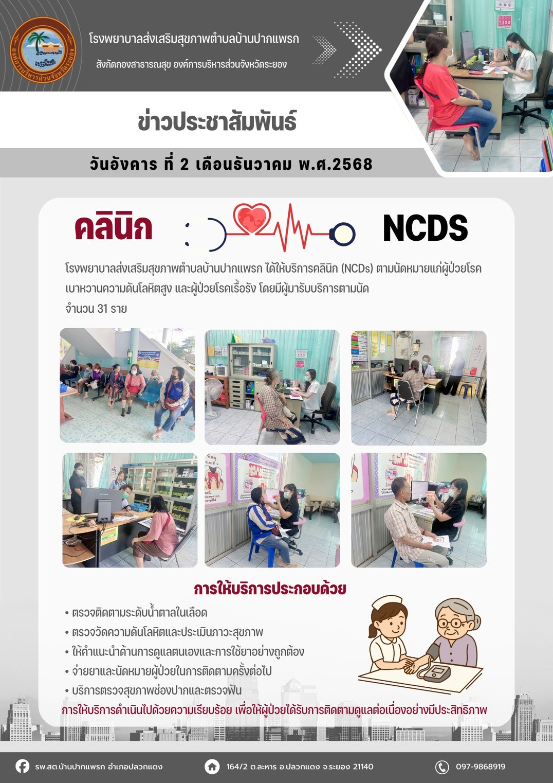 วันที่ 2 ธันวาคม 2568 รพ.สต.บ้านปากแพรก ได้ให้บริการคลินิก NCDs ตามนัดแก่ผู้ป่วยโรคเบาหวาน โรคความดันโลหิตสูง และโรคเรื้อรัง จำนวน 31 ราย
