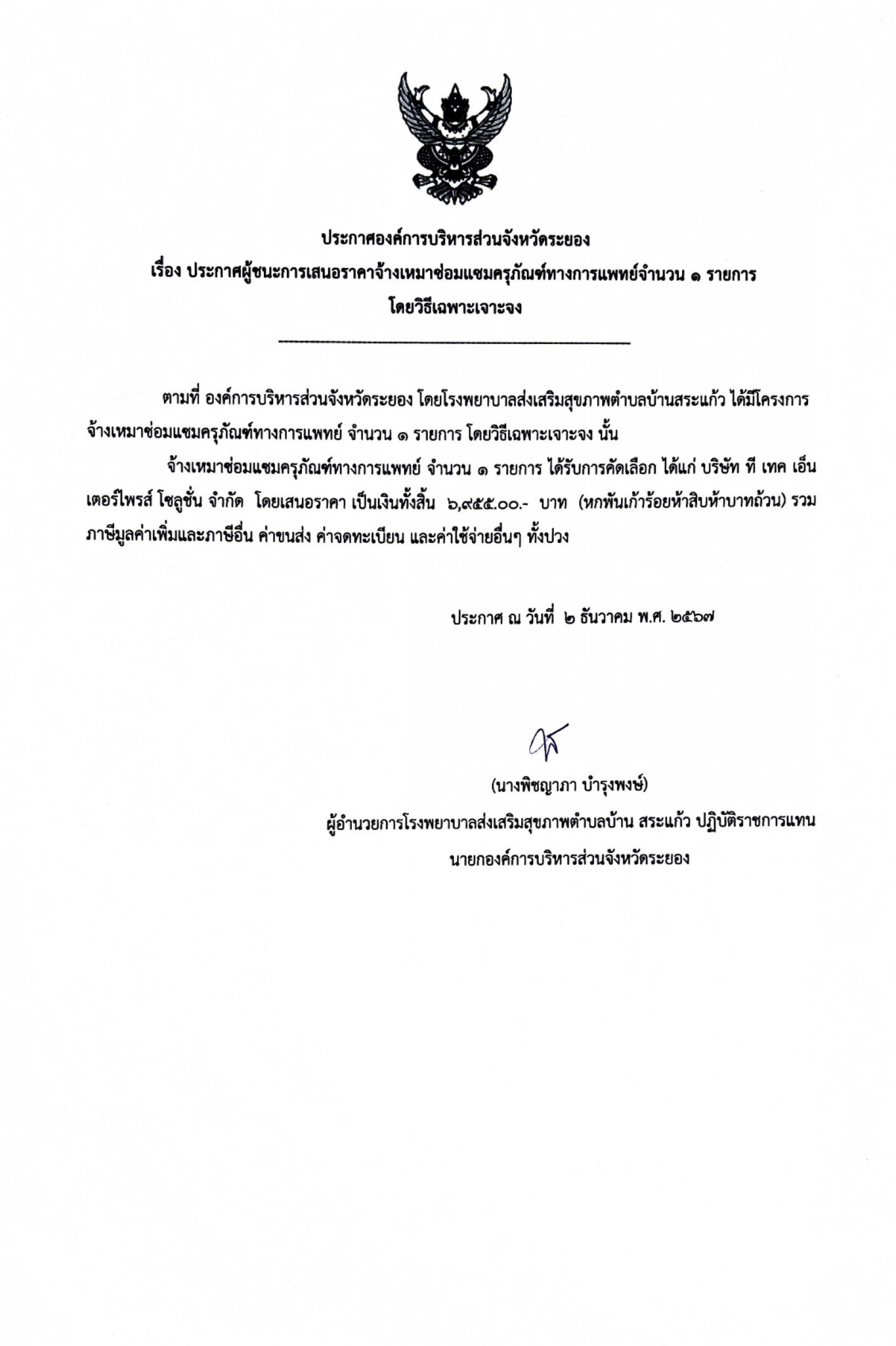 ประกาศผู้ชนะการเสนอราคาจ้างเหมาซ่อมแซมครุภัณฑ์ทางการแพทย์ จำนวน 1 รายการ โดยวิธีเฉพาะเจาะจง