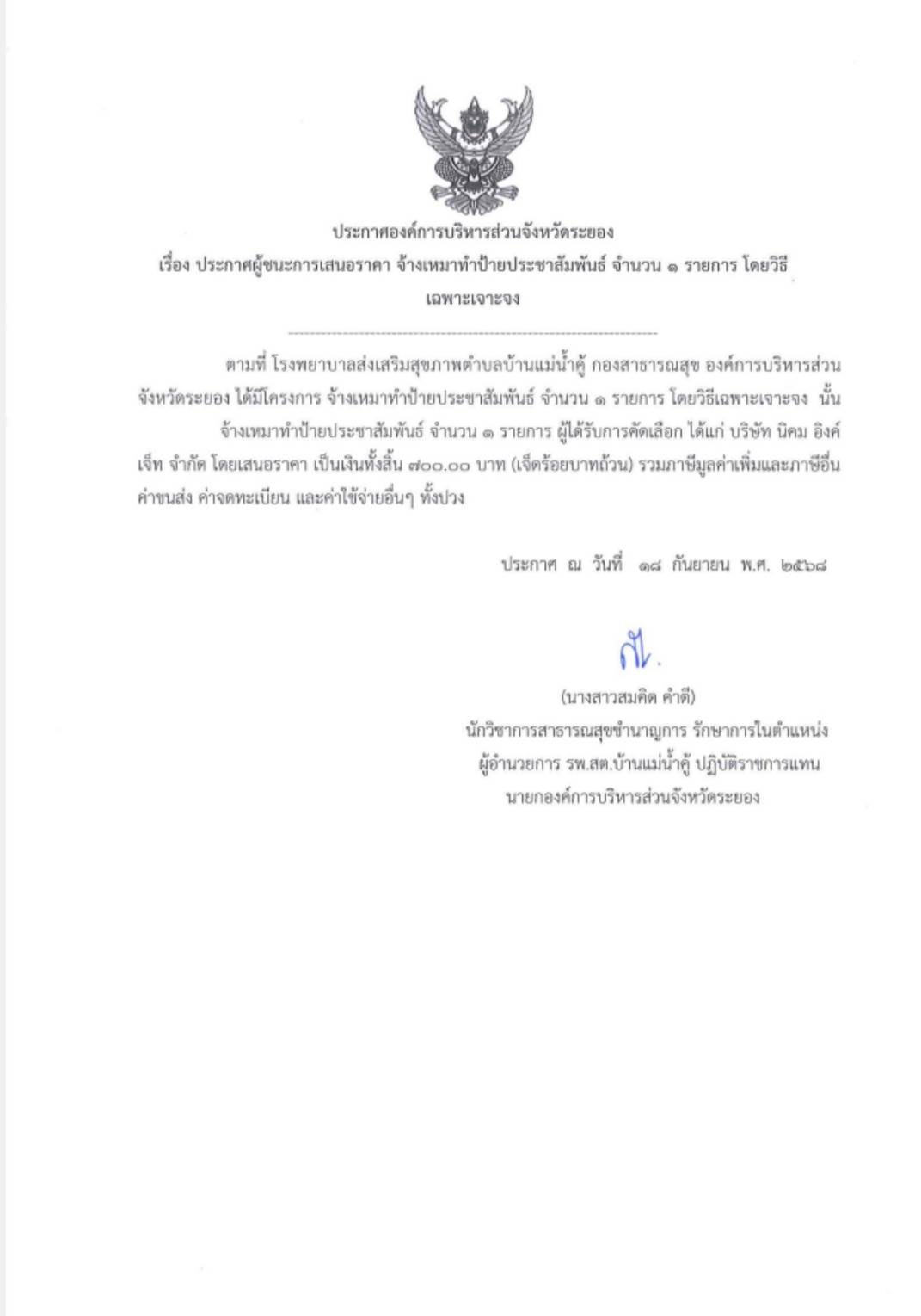 ประกาศผู้ชนะการเสนอราคา จ้างเหมาทำป้ายประชาสัมพันธ์ จำนวน ๑ รายการ โดยวิธีเฉพาะเจาะจง