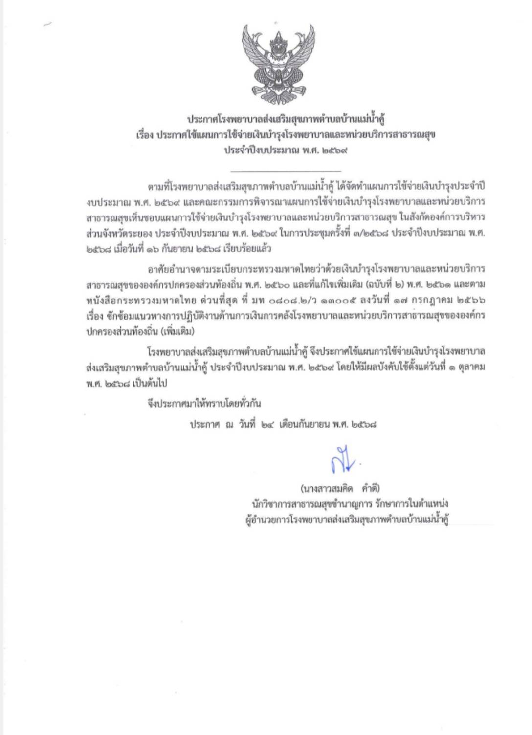 ประกาศใช้แผนการใช้จ่ายเงินบำรุงโรงพยาบาลและหน่วยบริการสาธารณสุข ประจำปีงบประมาณ พ.ศ. 2569