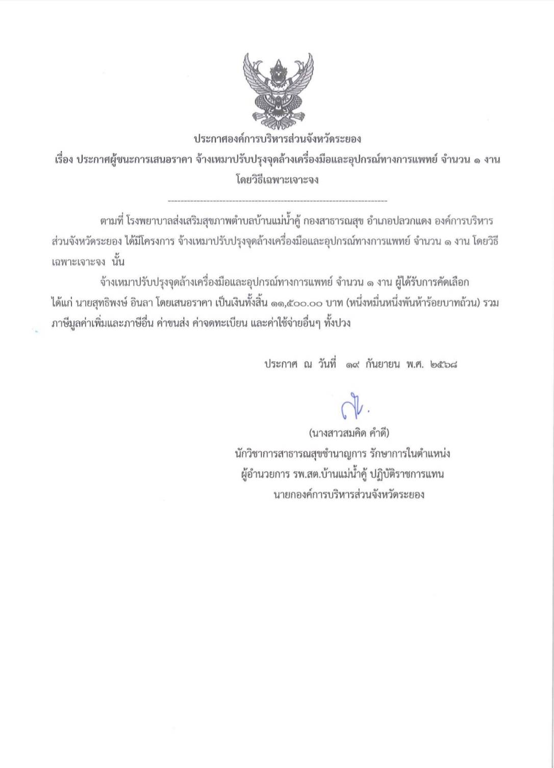 ประกาศผู้ชนะการเสนอราคาจ้างเหมาปรับปรุงจุดล้างเครื่องมือและอุปกรณ์ทางการแพทย์