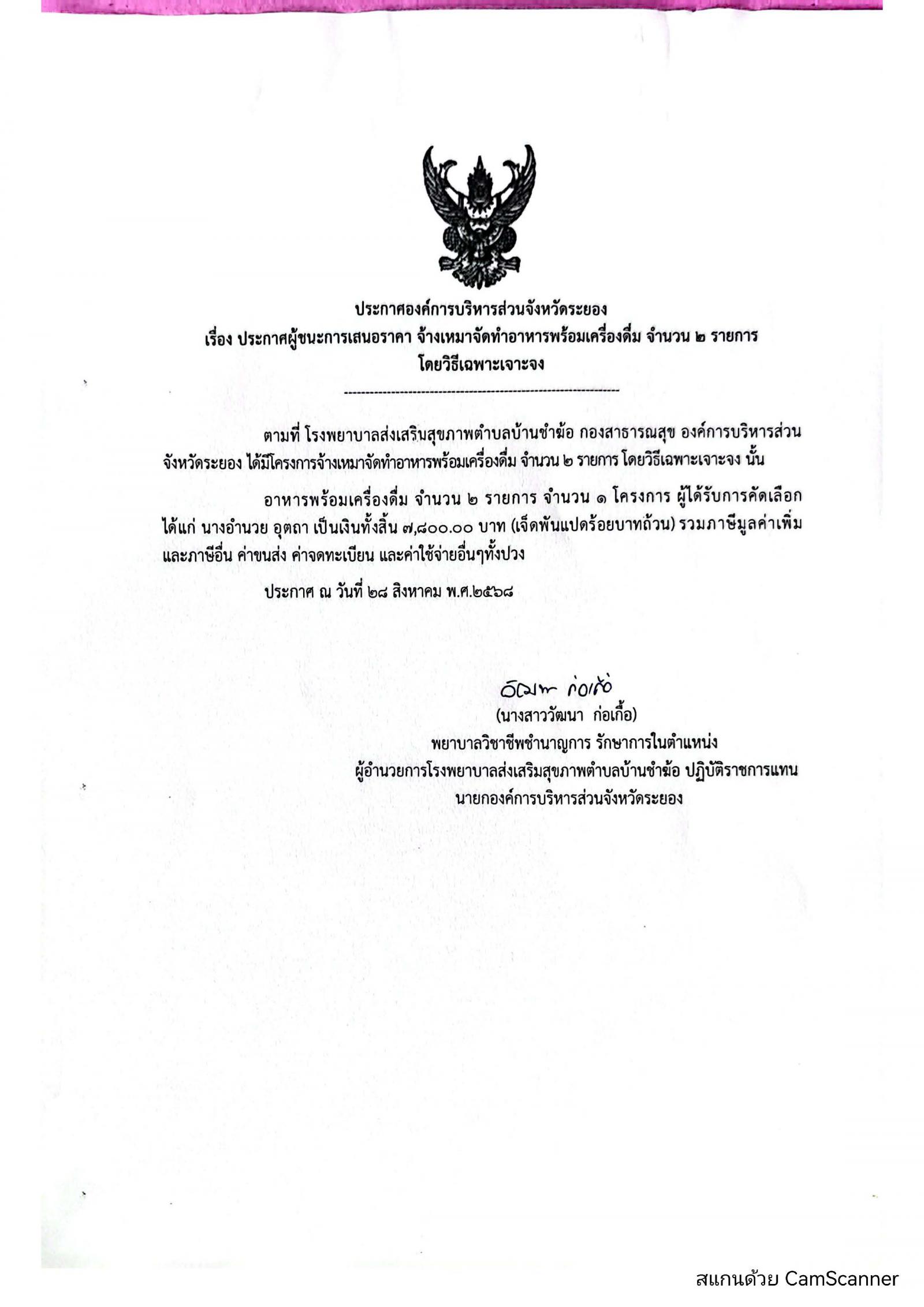 ประกาศผู้ชนะการเสนอราคา จ้างเหมาจัดทำอาหารพร้อมเครื่องดื่ม จำนวน 2 รายการ โดยวิธีเฉพาะเจาะจง