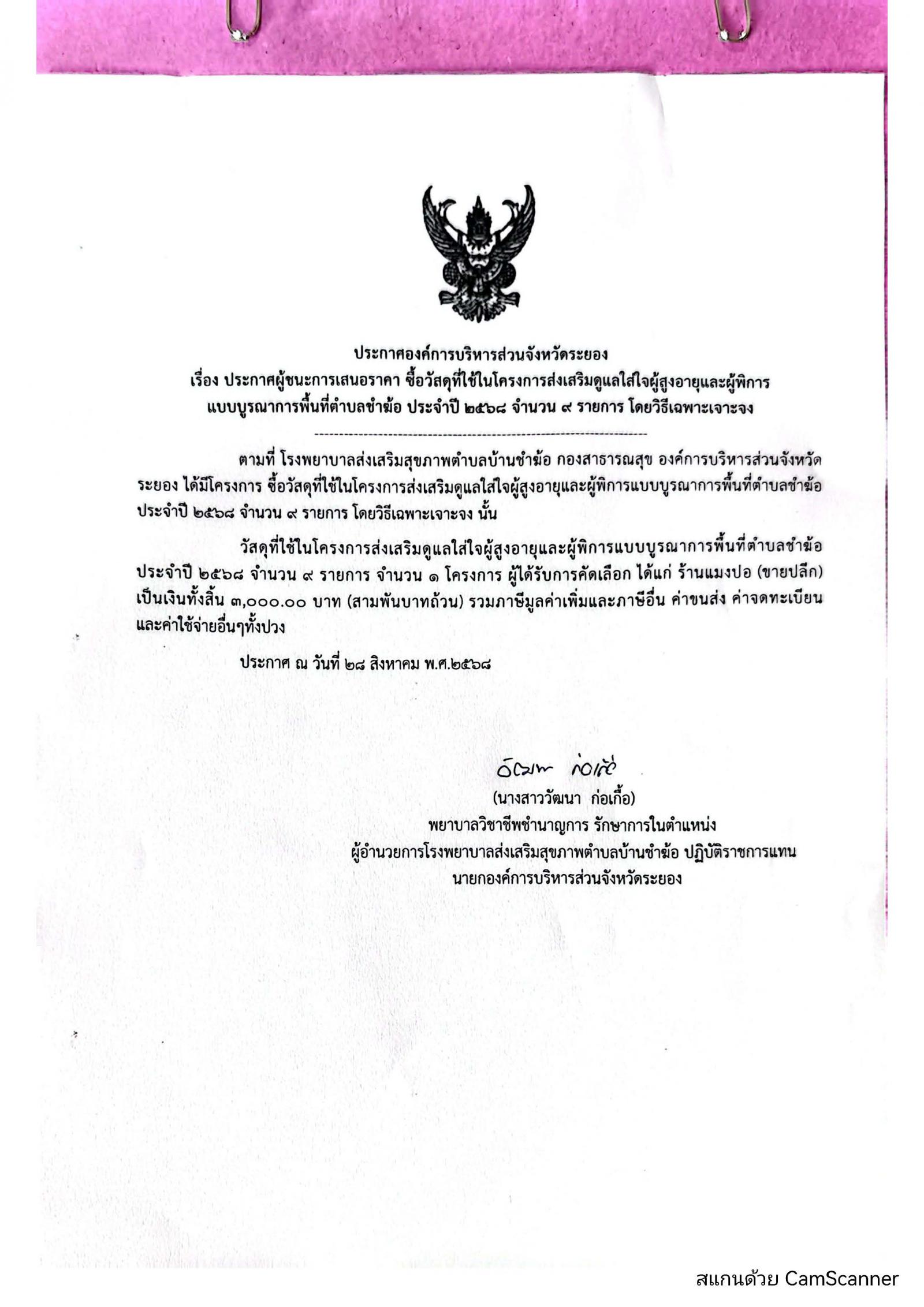 ประกาศผู้ชนะการเสนอราคา ซื้อวัสดุที่ใช้ในโครงการส่งเสริมดูแลใส่ใจผู้สูงอายุและผู้พิการแบบบูรณาการพื้นที่ตำบลชำฆ้อ ประจำปี 2568 จำนวน 9 รายการ โดยวิธีเฉพาะเจาะจง