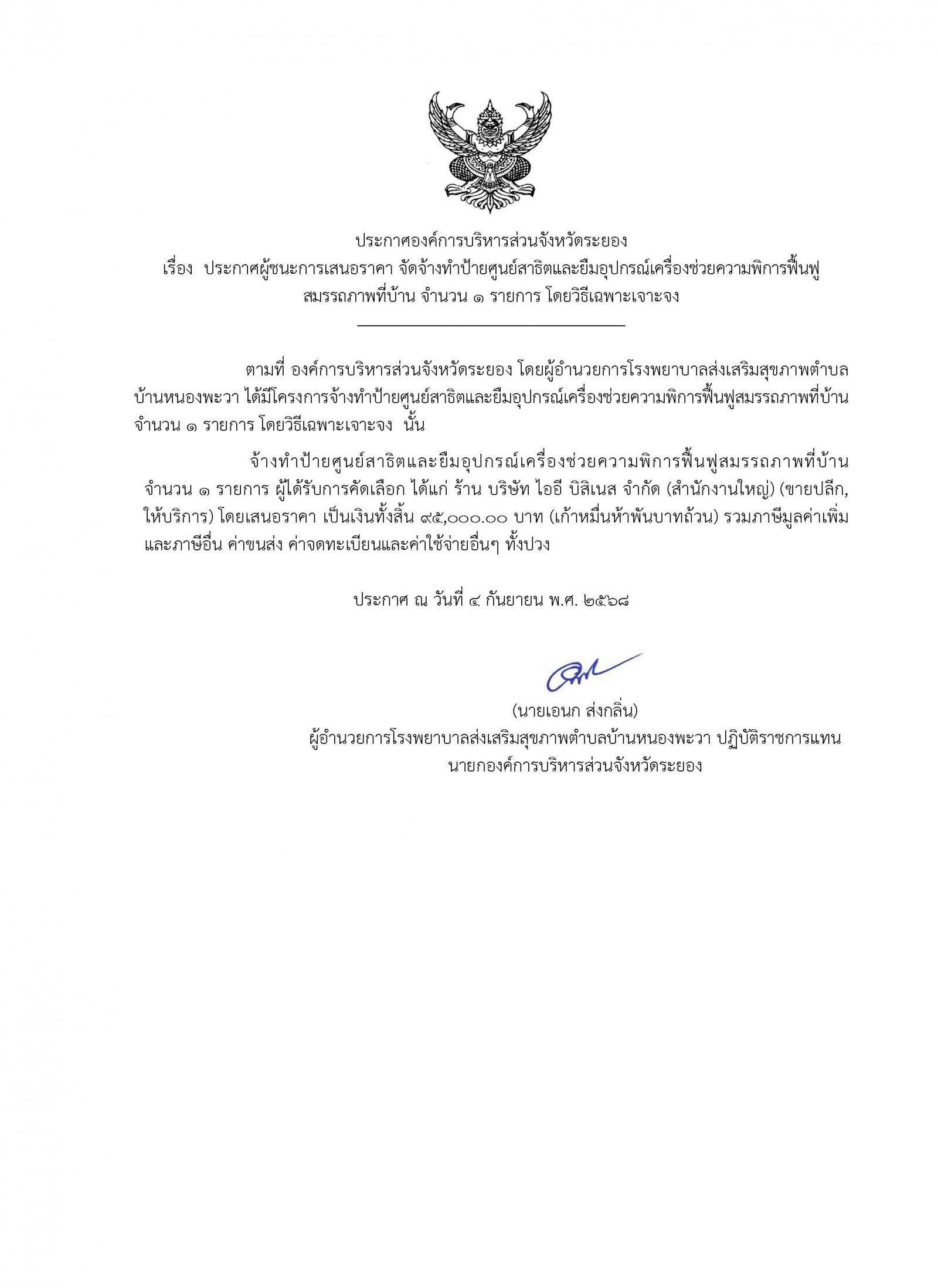 ประกาศผู้ชนะการเสนอราคา ประกวดราคาจ้างเหมาเจ้าหน้าที่รักษาความปลอดภัยโรงพยาบาลองค์การบริหารส่วนจังหวัดระยอง (ศูนย์บริการสุขภาพ ฟื้นฟูและดูแลผู้สูงอายุ) ด้วยวิธีประกวดราคาอิเล็กทรอนิกส์ (e-bidding)