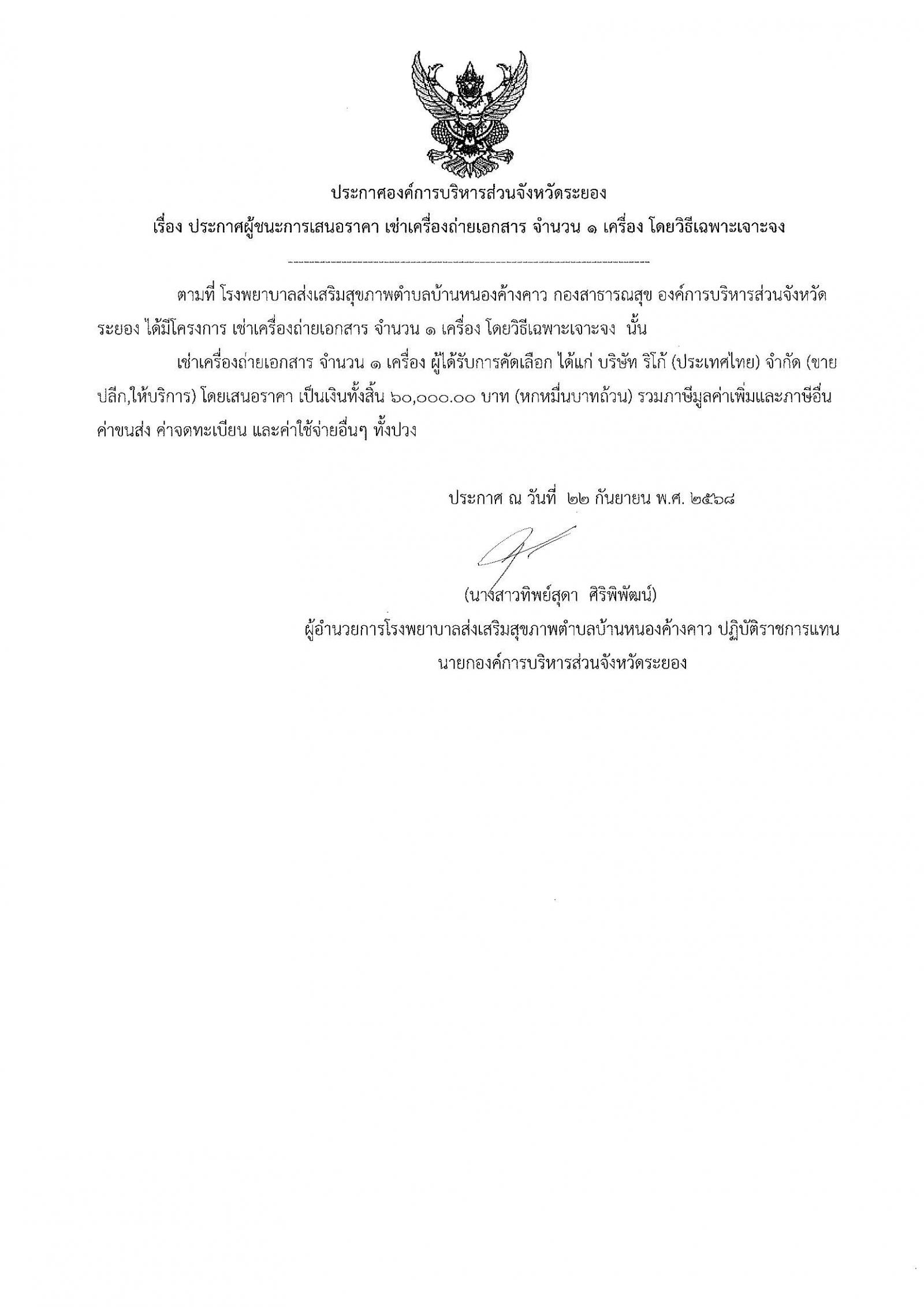 ประกาศผู้ชนะการเสนอราคา เช่าเครื่องถ่ายเอกสาร จำนวน 1 เครื่อง โดยวิธีเฉพาะเจาะจง