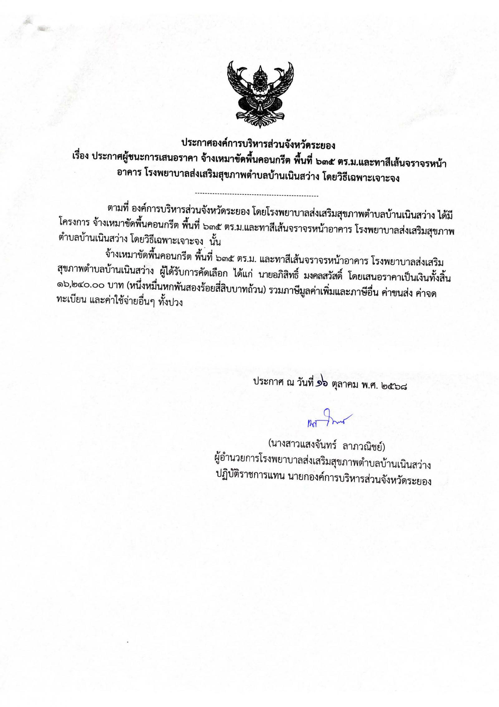 ประกาศผู้ชนะการเสนอราคา จ้างเหมาขัดพื้นคอนกรีต พื้นที่ 635 ตร.ม. และทาสีเส้นจราจรหน้าอาคาร รพ.สต.บ้านเนินสว่าง โดยวิธีเฉพาะเจาะจง