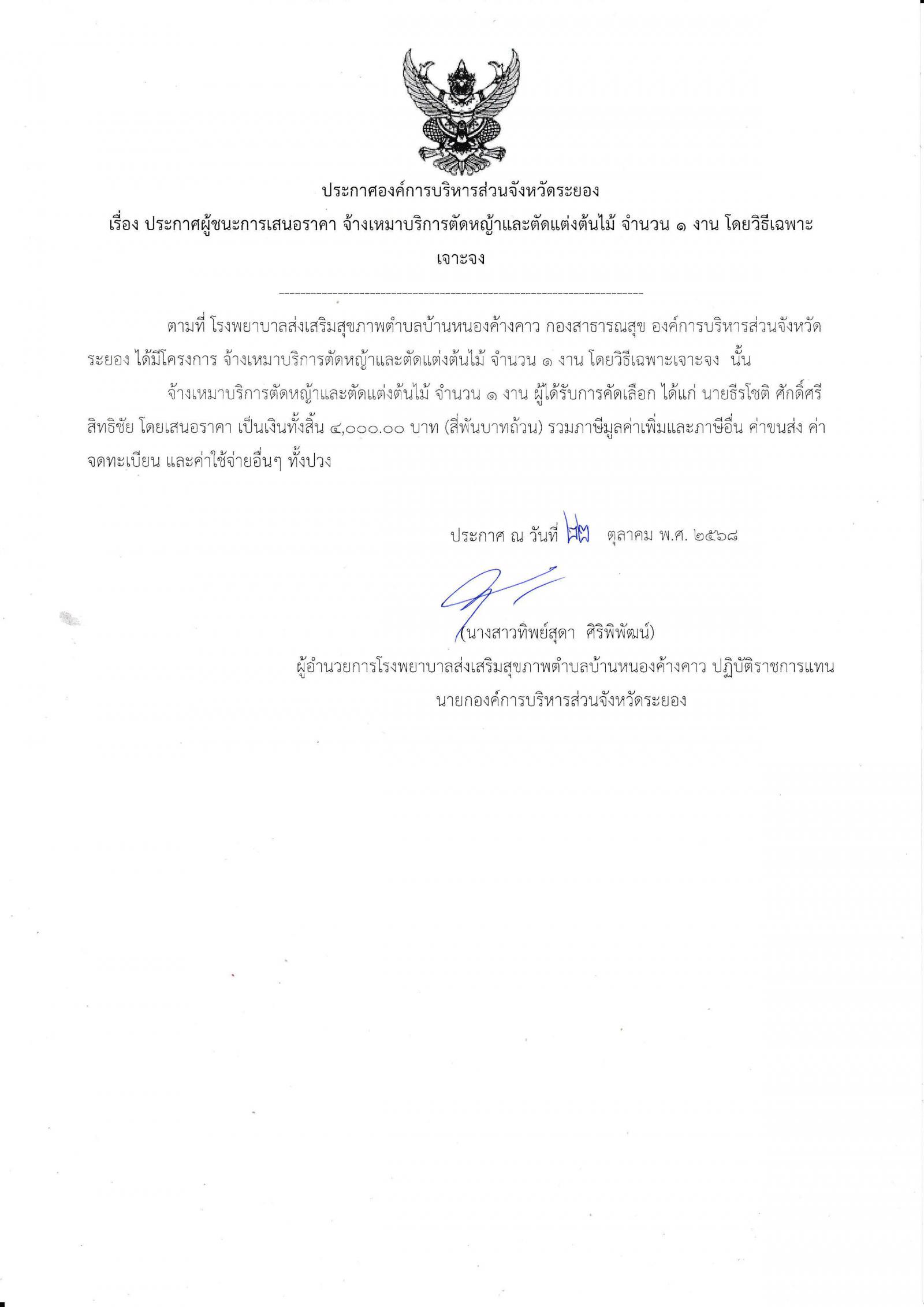 ประกาศผู้ชนะการเสนอราคา จ้างเหมากำจัดปลวก ภายในศูนย์บริการการพัฒนาปลวกแดงตามพระราชดำริ จังหวัดระยอง
