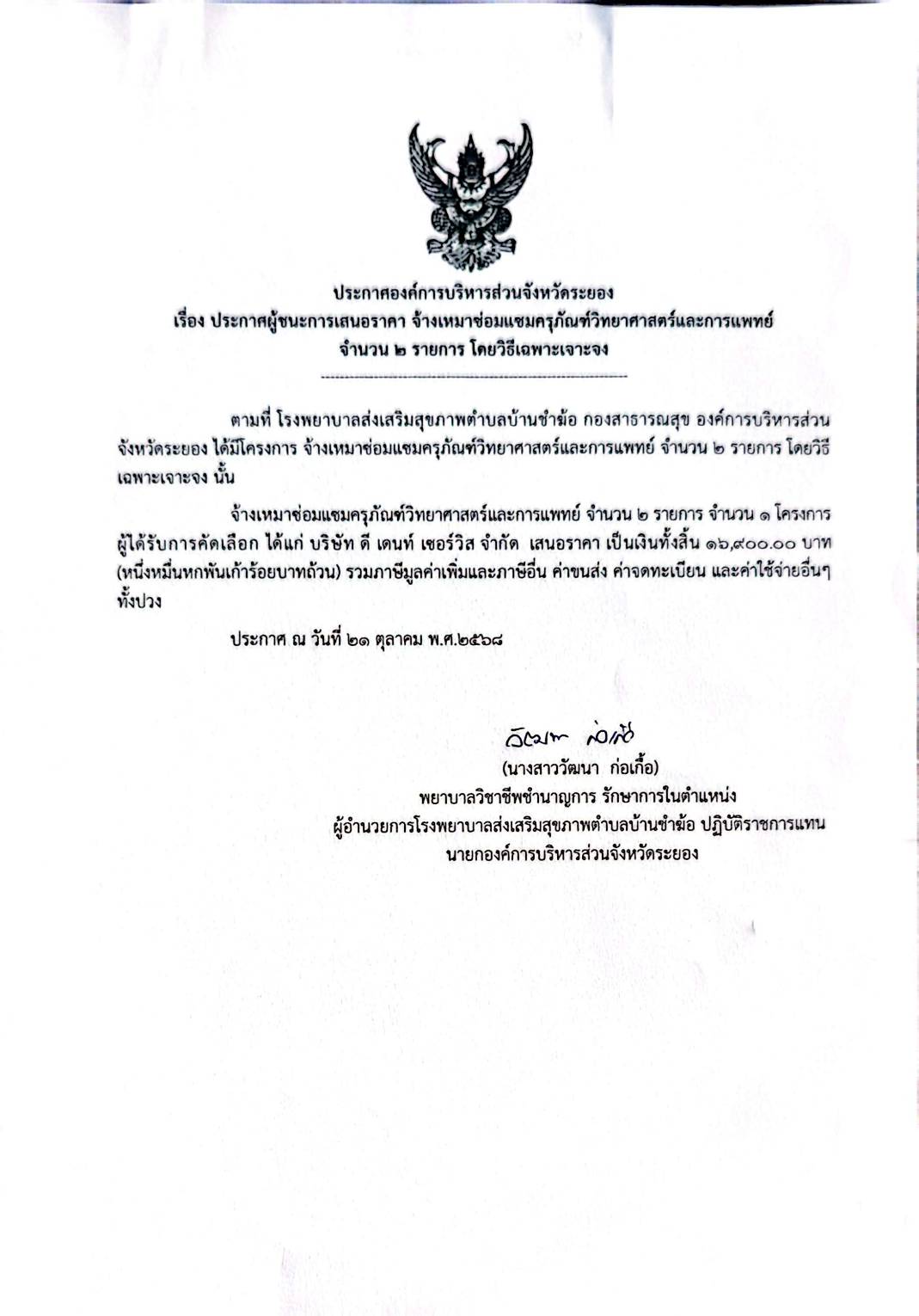 ประกาศผู้ชนะการเสนอราคา จ้างเหมากำจัดปลวก ภายในศูนย์บริการการพัฒนาปลวกแดงตามพระราชดำริ จังหวัดระยอง