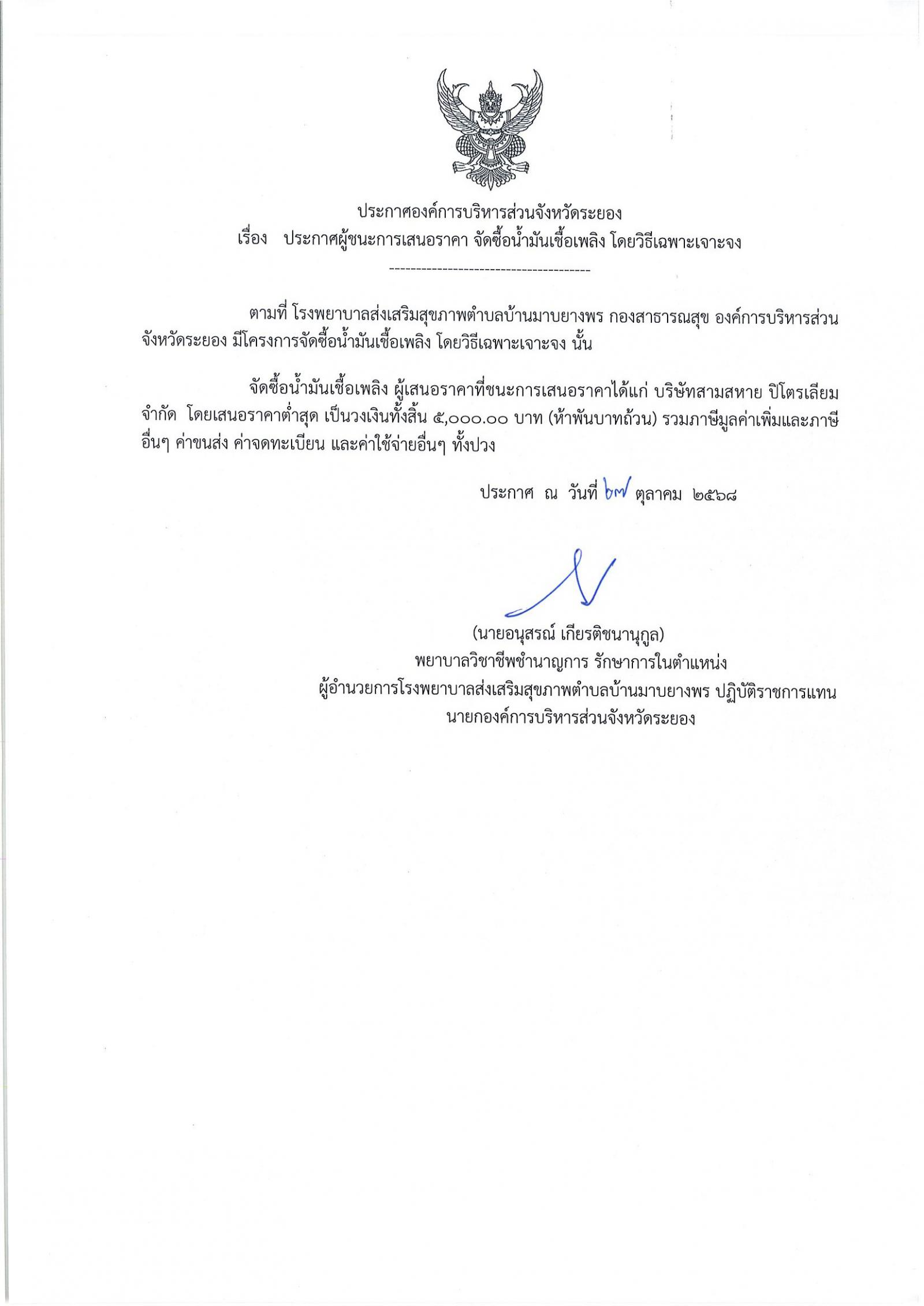 ประกาศผู้ชนะการเสนอราคา จัดซื้อน้ำมันเชื้อเพลิง โดยวิธีเฉพาะเจาะจง