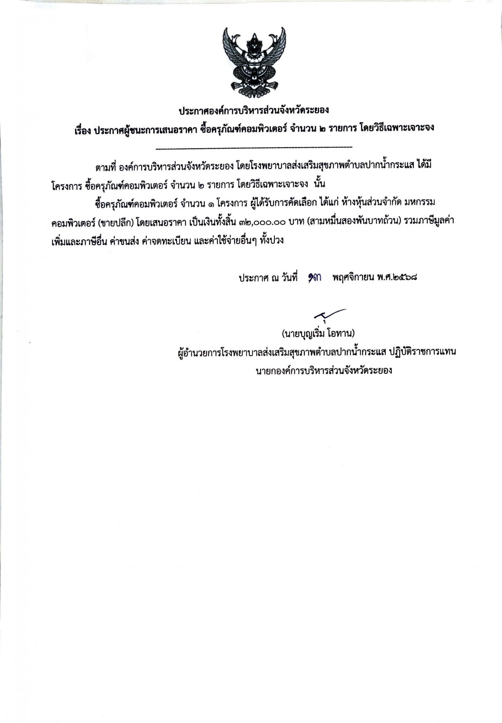 ประกาศผู้ชนะการเสนอราคา ซื้อครุภัณฑ์คอมพิวเตอร์ จำนวน 2 รายการ โดยวิธีเฉพาะเจาะจง