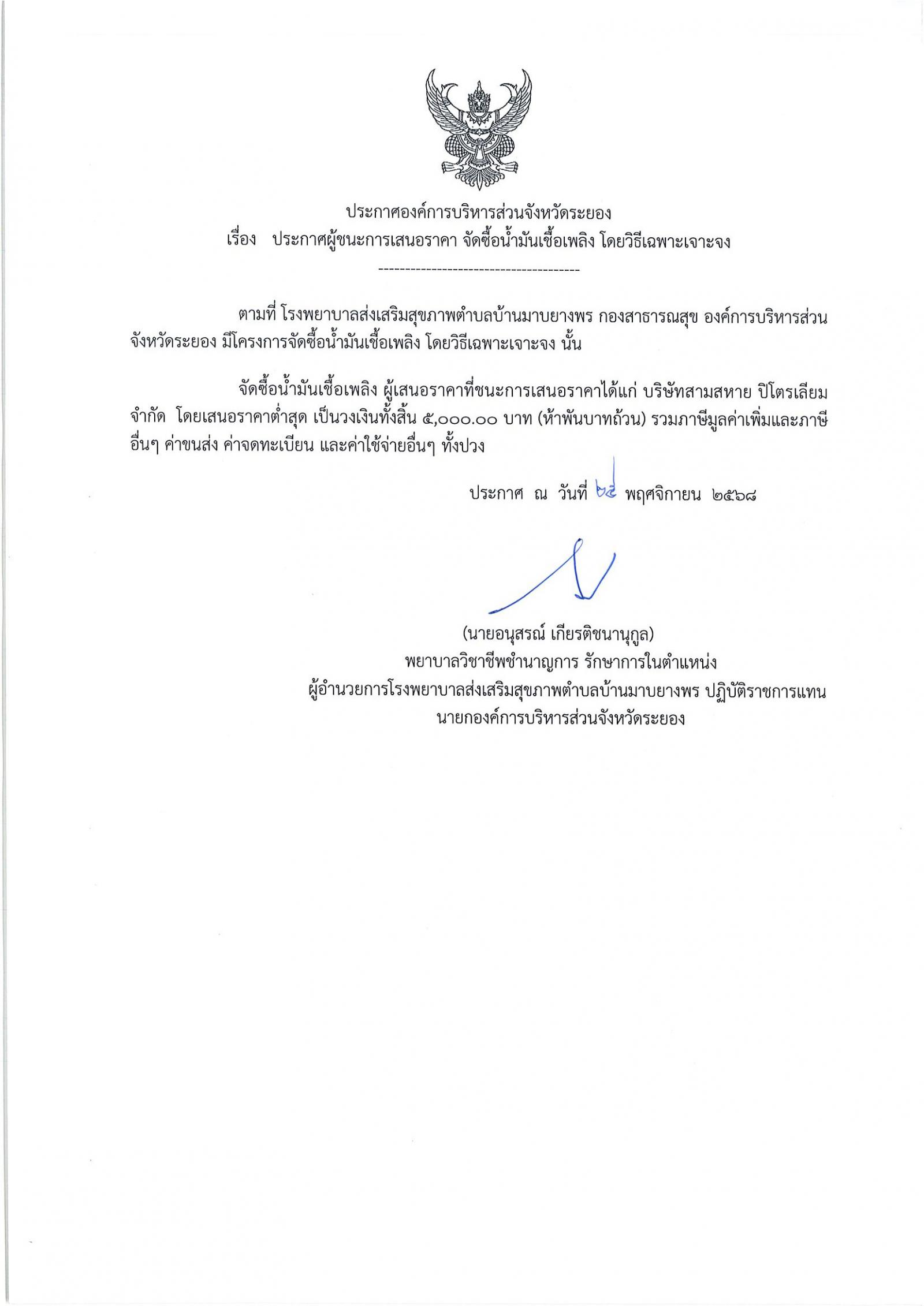 ประกาศผู้ชนะการเสนอราคา จ้ดซื้อน้ำมันเชื้อเพลิง โดยวิธีเฉพาะเจาะจง