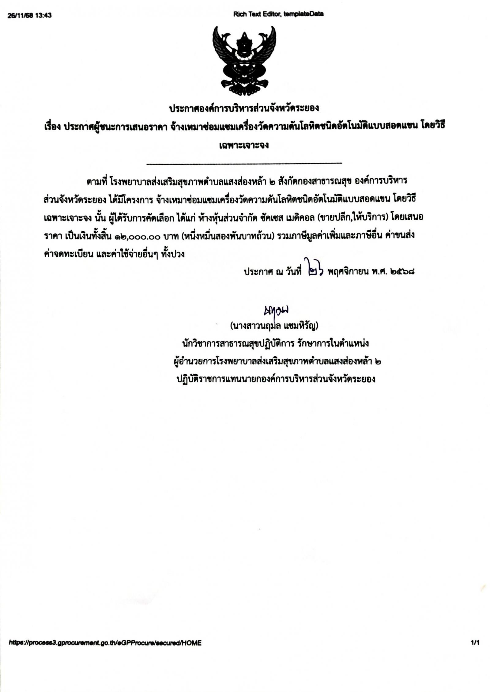 ประกาศผู้ชนะการเสนอราคา จ้างเหมาซ่อมแซมเครื่องวัดความดันโลหิตชนิดอัตโนมัติแบบสอดแขน โดยวิธีเฉพาะเจาะจง