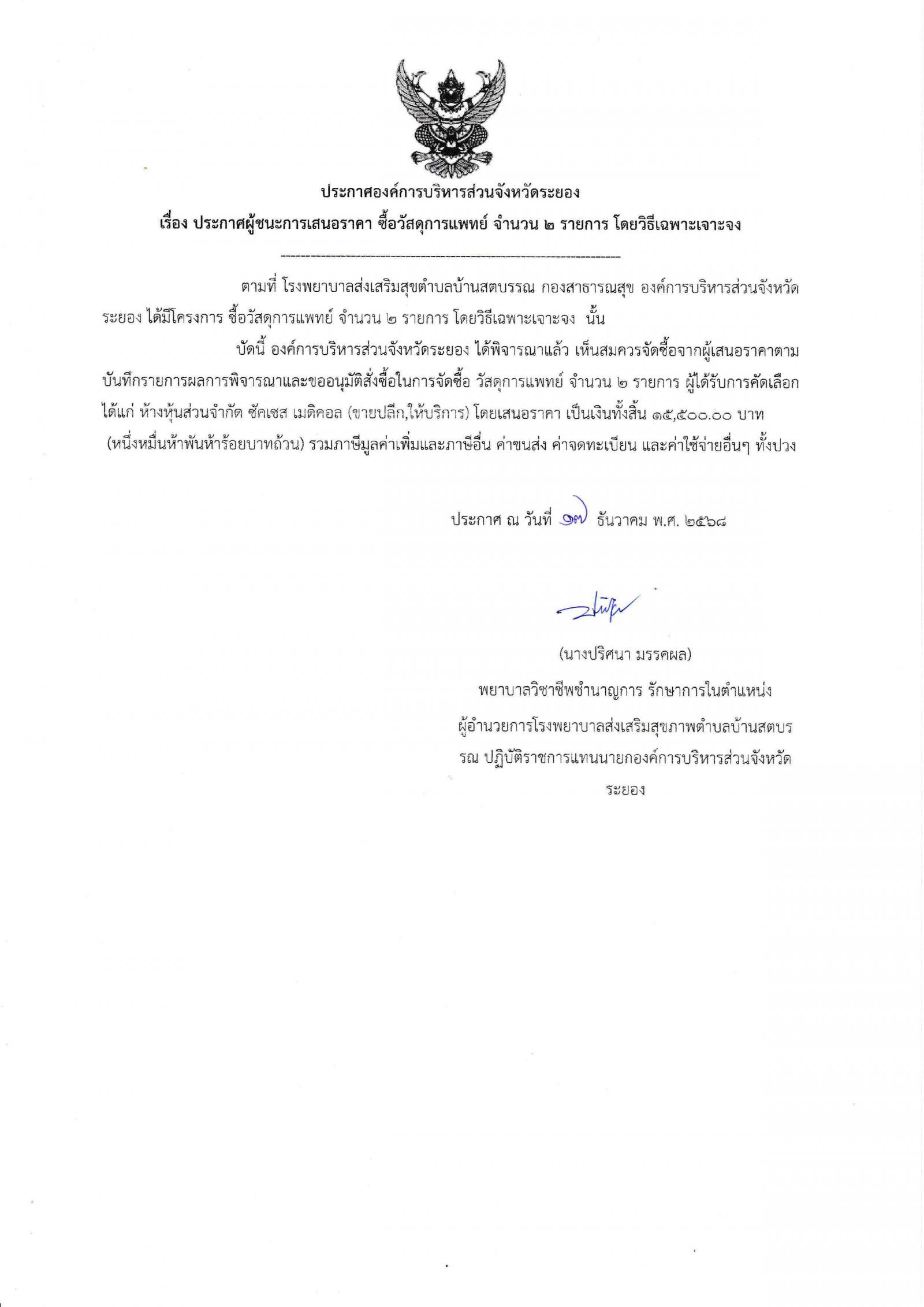 ประกาศผู้ชนะการเสนอราคา ซื้อวัสดุการแพทย์ จำนวน 2 รายการ โดยวิธีเฉพาะเจาะจง