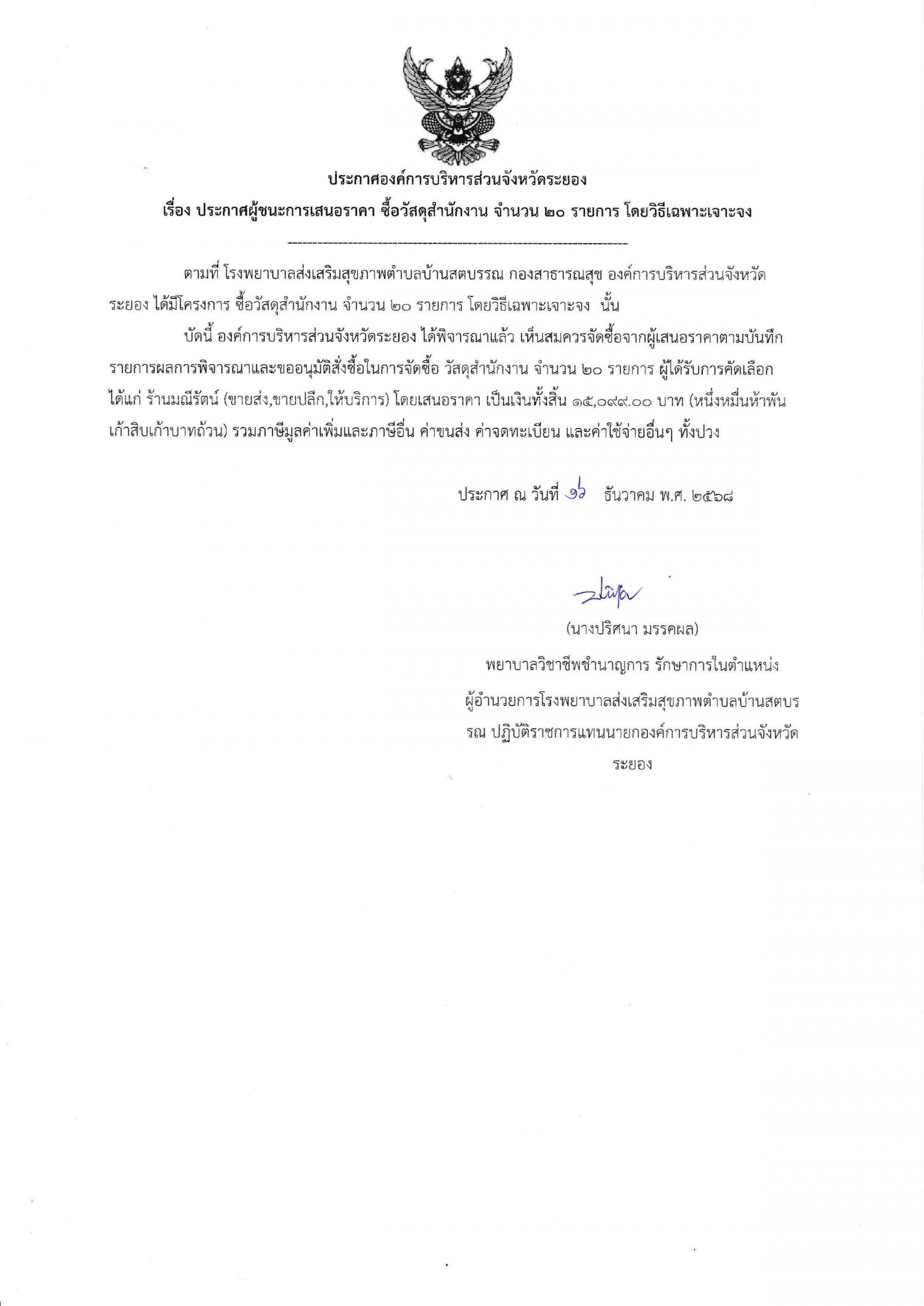 ประกาศผู้ชนะการเสนอราคา ซื้อวัสดุสำนักงาน จำนวน 20 รายการ โดยวิธีเฉพาะเจาะจง