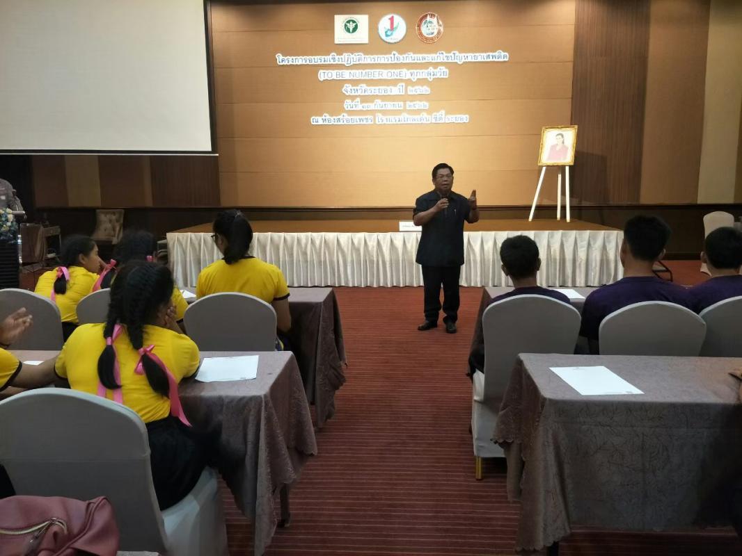 โครงการอบรมเชิงปฏิบัติการการป้องกันและแก้ไขปัญหายาเสพติด (TO BE NUMBER ONE) ทุกกลุ่มวัยจังหวัดระยอง ประจำปี 2562 วันที่ 13 กันยายน 2562 รวม 1 วัน ณ โรงแรมโกลเด้นซิตี้ จังหวัดระยอง โดยมีวัตถุประสงค์เพื่อส่งเสริมสนับสนุนให้แกนนำเด็กและเยาวชนมีการรวมกลุ่มและจัดตั้งชมรมทั้งในชุมชน สถานศึกษาเพื่อร่วมกันป้องกันและแก้ไขปัญหายาเสพติด”