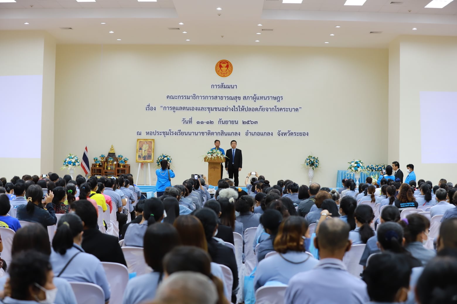 วันที่ 11 กันยายน 2563 เวลา 09.00 น. ณ หอประชุมโรงเรียนนานาชาติตากสินแกลง อำเภอแกลง จังหวัดระยอง นายปิยะ ปิตุเตชะ นายกองค์การบริหารส่วนจังหวัดระยอง เป็นประธานเปิดงาน พร้อมด้วย นายจรัญ ความเพียร เลขานุการนายกอบจ.ระยอง สมาชิกสภาองค์การบริหารส่วนจังหวัดระยอง โดย คณะกรรมาธิการการสาธารณสุข สภาผู้แทนราษฎร จัดสัมมนา เรื่อง “การดูแลตนเองและชุมชนอย่างไร ให้ปลอดภัยจากโรคระบาด” มีวัตถุประสงค์เพื่อถ่ายทอดองค์ความรู้ที่ถูกต้องตามหลักวิชาการเกี่ยวกับการป้องกันและควบคุมการระบาดของโรคติดเชื้อไวรัสโคโรนา 2019 (โควิด-19) รวมทั้งโรคระบาดอื่นๆ ที่อาจจะเกิดขึ้นในอนาคต โดยมี ผู้เข้าร่วมงานจากหน่วยงานต่างๆอาทิ คณะกรรมาธิการการสาธารณสุข สภาผู้แทนราษฎร ผู้แทนสำนักงานสาธารณสุขจังหวัด ผู้แทนโรงพยาบาลชุมชน โรงพยาบาลส่งเสริมสุขภาพประจำตำบล อาสาสมัครสาธารณสุข (อสม.) กว่า 500 คน เข้าร่วมงานอย่างพร้อมเพรียง ภายในงานมีการบรรยาย เรื่อง หลักการดูแลตนเองและชุมชนให้ปลอดภัยจากโรคโควิด-19 โดยนายแพทย์บัญญัติ เจตนจันทร์ สมาชิกสภาผู้แทนราษฎรจังหวัดระยอง ในฐานะเลขานุการคณะกรรมาธิการการสาธารณสุข สภาผู้แทนราษฎร ตัวแทนสาธารณสุขจังหวัดระยอง หลังจากนั้นมีการอภิปราย เรื่อง บทบาท อสม.ในการดูแลตนเองและชุมชนให้ปลอดภัยจากโรคโควิด-19 และร่วมกันแบ่งกลุ่มนำเสนอผลปัญหาและอุปสรรคการปฏิบัติงานของอสม.