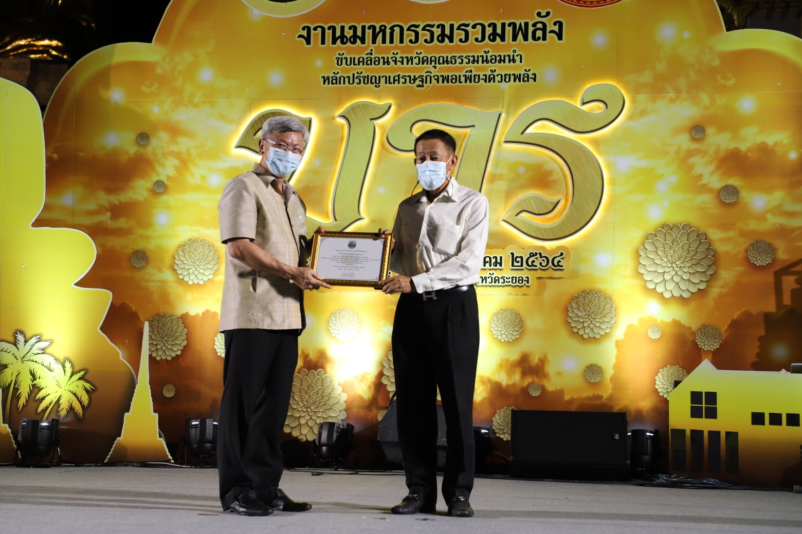 วันศุกร์ที่ 19 มีนาคม 2564 เวลา 16.30 น. นายประสานต์ พฤกษชาติ รองนายกองค์การบริหารส่วนจังหวัดระยอง (2) พร้อมด้วย นายอรุณ วิชกิจ ผู้เชี่ยวชาญด้านการวางแผนและวิเคราะห์นโยบาย และนายสมบัติ มุมทอง หัวหน้าสำนักปลัดองค์การบริหารส่วนจังหวัด ได้รับมอบหมายเป็นตัวแทนเข้าร่วมพิธีรับมอบใบประกาศเกียรติบัตร ฯ ในพิธีเปิดงานมหกรรมรวมพลังชุมชนคุณธรรมน้อมนำหลักปรัชญาของเศรษฐกิจพอเพียงขับเคลื่อนด้วยพลัง “บวร” จังหวัดระยอง ประจำปีงบประมาณ พ.ศ.2564 ระหว่างวันที่ 19-21 มีนาคม 2564 ณ วัดละหารไร่ อำเภอบ้านค่าย จังหวัดระยอง โดยมี นายชาญนะ เอี่ยมแสง ผู้ว่าราชการจังหวัดระยอง เป็นประธานพิธี การจัดแสดงมหกรรมผลสำเร็จการดำเนินงาน “น้อมนำแนวพระราชดำริของสมเด็จพระกนิษฐาธิราชเจ้ากรม สมเด็จพระเทพรัตนราชสุดาฯ สยามบรมราชกุมารี สู้แผนปฏิบัติการ 90 วัน ปลูกผักสวนครัวเพื่อสร้างความมั่นคงทางอาหาร” ระยะที่ 2 สร้างวัตนธรรมปลูกพืชผักประจำครัวเรือน มีวัตถุประสงค์เพื่อส่งเสริมให้ชุมชนคุณธรรมเป็นศูนย์กลางในการส่งเสริมการเรียนรู้ด้านหลักธรรมทางศาสนาหลักปรัชญาเศรษฐกิจพอเพียง ประเพณี วิถีวัฒนธรรมไทย ตลอดจนเป็นการกระตุ้นเศรษฐกิจของจังหวัดระยอง หลังจากการแพร่ระบาดของโรคติดเชื้อไวรัสโคโรนา 2019 (โควิด-19) กิจกรรมที่จัดขึ้น อาทิ การประกวดบูธนิทรรศการชุมชนคุณธรรม ไหว้พระดี-เกจิดัง การคัดเลือกบุคคลต้นแบบคุณธรรม และผลิตภัณฑ์พื้นบ้าน การแสดงทางศิลปวัฒนธรรม เป็นต้น