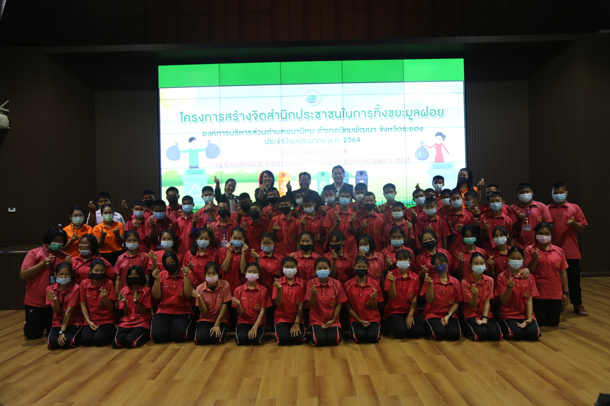 วันที่ 24 มีนาคม 2564 เวลา 08.30 น. องค์การบริหารส่วนตำบลพนานิคม อำเภอนิคมพัฒนา จังหวัดระยอง ได้จัดโครงการสร้างจิตสำนึกประชาชนในการทิ้งขยะมูลฝอย โดยได้นำคณะครูและนักเรียน โรงเรียนนิคมสร้างตนเองจังหวัดระยอง 4 จำนวน 74 คน เข้าร่วมอบรม ณ โครงการศูนย์บริการพัฒนาปลวกแดงตามพระราชดำริ จ.ระยอง โดยมุ่งเน้นให้ความสำคัญ รณรงค์ ส่งเสริมความรู้ ความเข้าใจ ด้านการบริหารจัดการขยะในพื้นที่ตำบลพนานิคมให้เป็นไปตามมาตรฐานสิ่งแวดล้อม