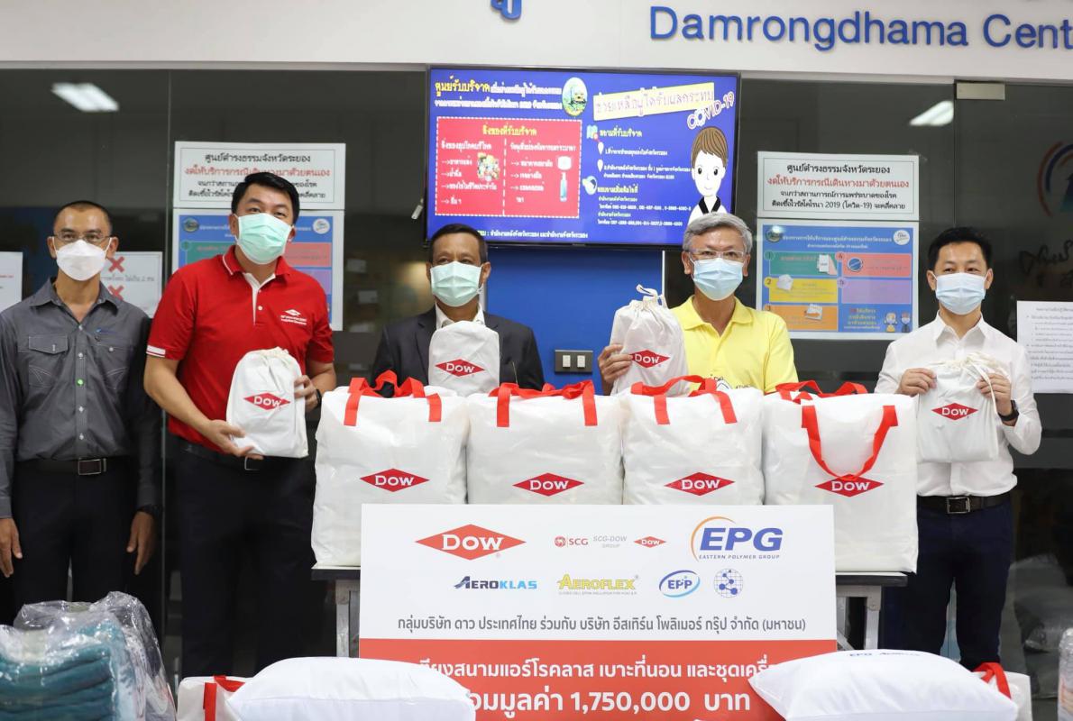 วันที่ 8 กันยายน 2564 เวลา 11.00 น. ณ ศาลากลางจังหวัดระยอง นายชาญนะ เอี่ยมแสง ผู้ว่าราชการจังหวัดระยอง ว่าที่ร้อยตรีพิรุณ เหมะรักษ์ รองผู้ว่าราชการจังหวัดระยอง นายกิตติ เกียรติ์มนตรี รองนายกองค์การบริหารส่วนจังหวัดระยอง (1) เข้ารับมอบสนับสนุนเตียงสนามแอร์โรคลาส เบาะที่นอน และชุดเครื่องนอน จำนวน 200 ชุด มูลค่า 1,750,000 บาท จากกลุ่มบริษัท ดาว ประเทศไทย ร่วมกับ บริษัท อีสเทิร์น โพลิเมอร์ กรุ๊ป จำกัด (มหาชน) เพื่อนำไปใช้รองรับผู้ป่วยติดเชื้อโควิด-19 ที่เข้ารับการรักษาในโรงพยาบาลสนามในจังหวัดระยอง