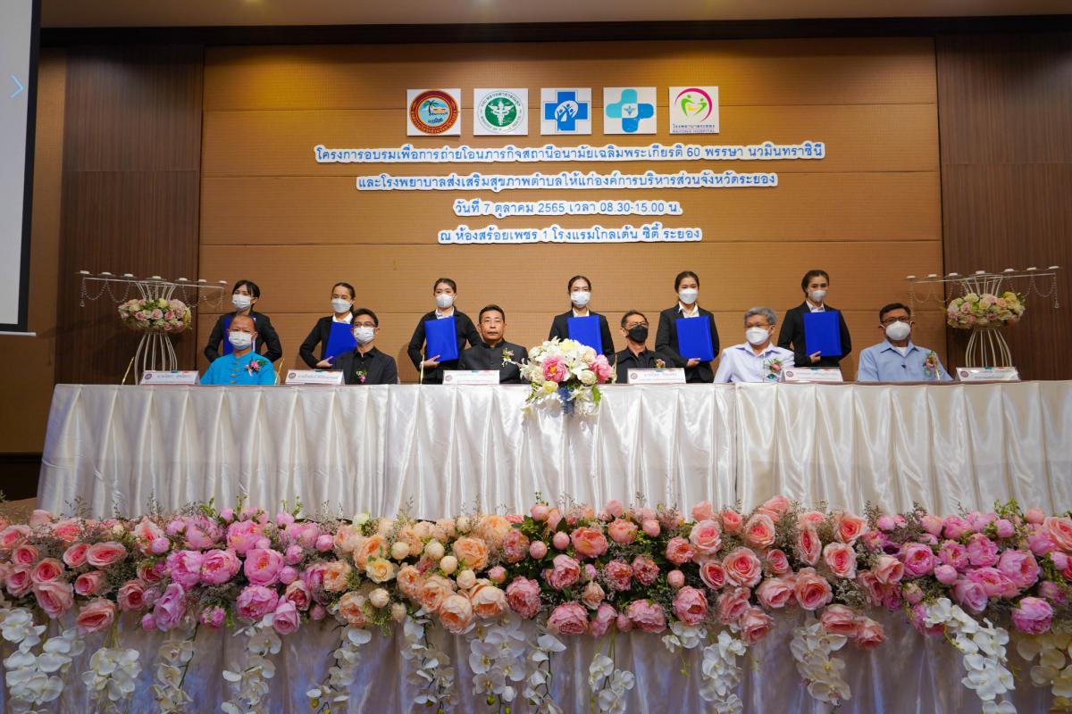 “พิธีลงนามบันทึกข้อตกลง (MOU) การถ่ายโอนสถานีอนามัยเฉลิมพระเกียรติ 60 พรรษา นวมินทราชินี (สอน.) และโรงพยาบาลส่งเสริมสุขภาพตำบล (รพ.สต.) ทั้ง 40 แห่ง ให้แก่ อบจ.ระยอง”