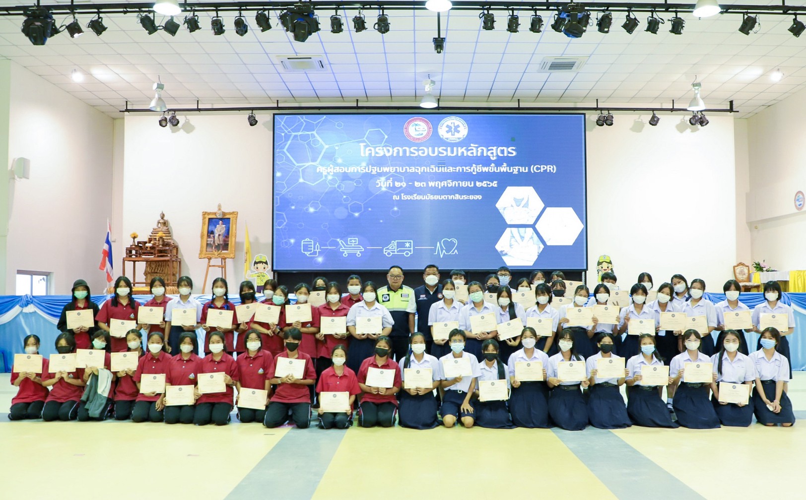 วันที่ 23 พฤศจิกายน 2565 การอบรมตามหลักสูตรครูผู้สอนการปฐมพยาบาลฉุกเฉินและการกู้ชีพขั้นพื้นฐาน CPR ณ หอประชุมอาคารเอนกประสงค์ ชั้น 3 โรงเรียนมัธยมตากสิน ซึ่งมีผู้เข้าร่วมโครงการอบรมในครั้งนี้ จำนวน 120 คน และแบ่งการอบรมออกเป็น 2 กลุ่มๆละ 60 คน ซึ่งโครงการอบรมหลักสูตรครูผู้สอนการปฐมพยาบาลฉุกเฉินและการกู้ชีพขั้นพื้นฐาน CPR ภายใต้การดำเนินงานของ อบจ.ระยอง ซึ่งได้ตระหนักและเห็นความสำคัญของการฟื้นคืนชีพในผู้ป่วยหัวใจหยุดเต้นนอกโรงพยาบาล จึงได้จัดอบรมหลักสูตรนี้ขึ้น ในระหว่างวันที่ 21-23 พฤศจิกายน 2565 โดยแบ่งการอบรมออกเป็น 2 กลุ่ม ซึ่งกลุ่มที่ 1เป็นกลุ่มบุคลากรในสังกัด อบจ.ระยอง, บุคลากรในสถานศึกษาที่สังกัด อบจ.ระยอง, เจ้าหน้าที่จากสมาคมและมูลนิธิ/กู้ภัยของ จ.ระยอง และประชาชนผู้ที่สนใจทั่วไป จำนวน 60 คน ซึ่งจะอบรมในระหว่างวันที่ 21-22 พฤศจิกายน 2565 และกลุ่มที่ 2 จะเป็นกลุ่มของนักเรียนในสถานศึกษาสังกัดองค์การบริหารส่วนจังหวัดระยอง จำนวน 60 คน ซึ่งจะเข้ารับการอบรมในวันที่ 23 พฤศจิกายน 2565 ซึ่งผู้เข้ารับการอบรมทุกท่านจะได้รับความรู้และทักษะในการปฐมพยาบาลฉุกเฉิน การกู้ชีพขั้นพื้นฐาน CPR การใช้เครื่องกระตุ้นไฟฟ้าหัวใจอัตโนมัติ AED ในการช่วยเหลือผู้ที่มีภาวะหัวใจหยุดเต้นแบบเฉียบพลัน พร้อมกันนี้จะได้รับความรู้จากระบบการแพทย์ฉุกเฉินและสิทธิผู้ป่วยฉุกเฉินวิกฤต UCEP จากวิทยากรจากสถาบันการแพทย์ฉุกเฉินแห่งชาติ และวิทยากรจากศูนย์การเรียนรู้ชมรมกู้ภัยสว่าง ชลบุรี