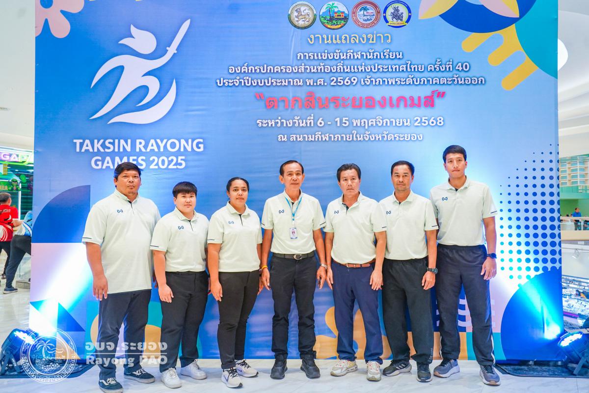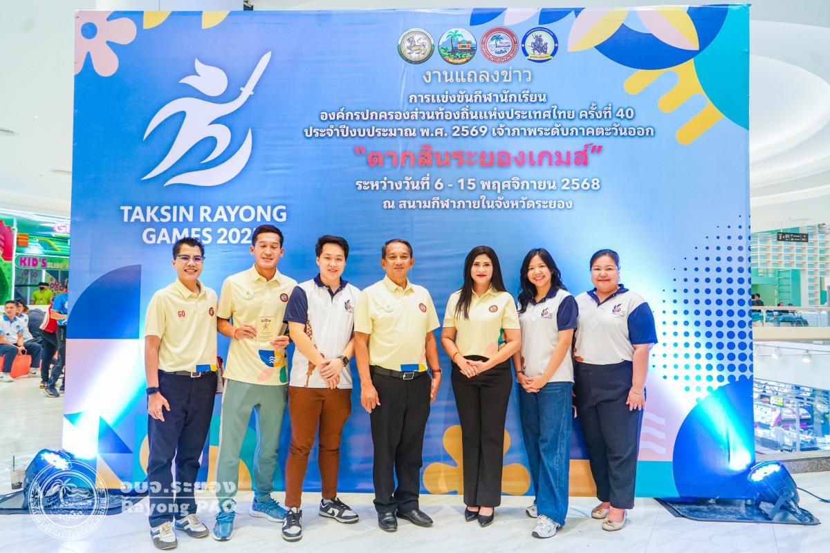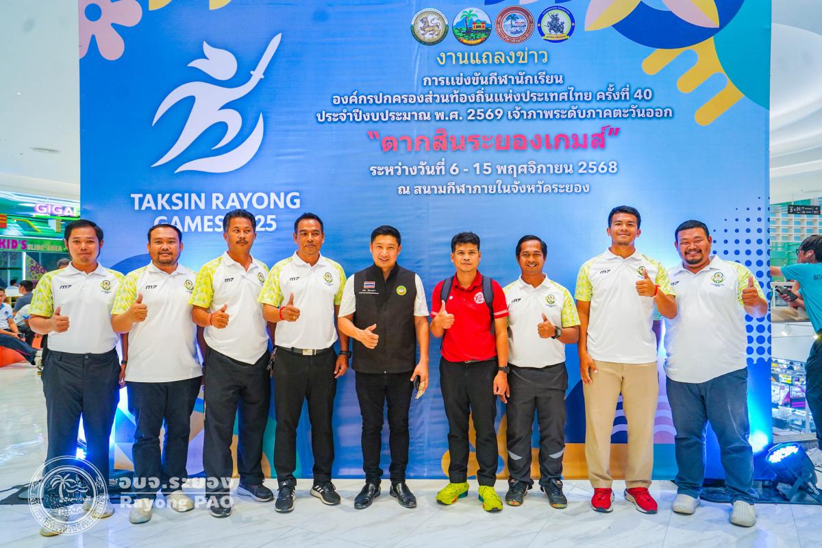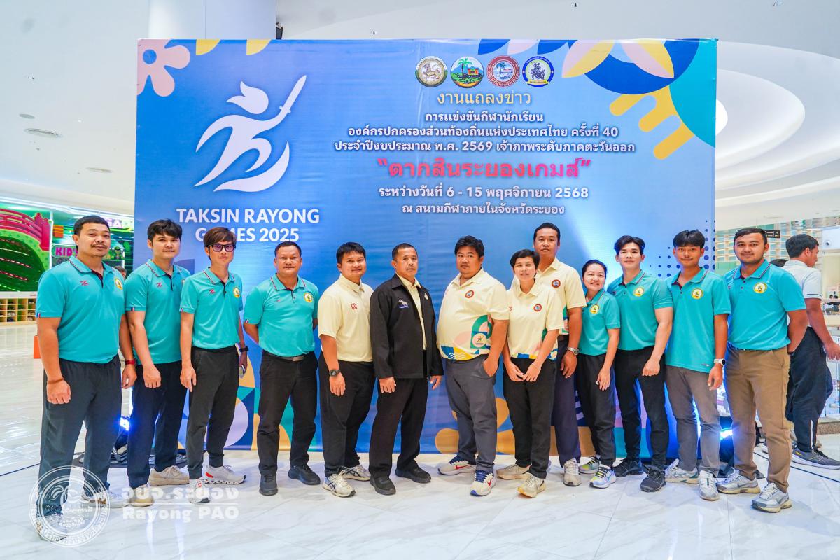 วันที่ 10 ตุลาคม 2568 เวลา 14.00 น. ณ ศูนย์การค้าแพชชั่น ช้อปปิ้ง เดสติเนชั่น ชั้น 3 ลานกิจกรรมหน้าแพชชั่น ฮอลล์ นายประสานต์ พฤกษาชาติ รองนายกองค์การบริหารส่วนจังหวัดระยอง (2) พร้อมด้วย นายวิเชียร แสงวงศ์กิจ นายกสมาคมกีฬาแห่งจังหวัดระยอง, พ.ต.ท.คำพันธ์ ขวัญทอง รอง ผกก.จร.สภ.เมืองระยอง, นางสาวสริญทิพญ ทัพมงคลทรัพย์ ประธานสภาอุตสาหกรรมท่องเที่ยวจังหวัดระยอง, วสุศิวกิจ ภูสีฤทธิ์ นักกีฬาฟุตบอลสโมสรระยองเอฟซี คณะผู้บริหาร ผู้แทนองค์กรปกครองส่วนท้องถิ่น 9 จังหวัด และผู้ที่เกี่ยวข้องเข้าร่วมงานแถลงข่าวและจับฉลากแบ่งสายการแข่งขันกีฬานักเรียนองค์กรปกครองส่วนท้องถิ่นแห่งประเทศไทย ครั้งที่ 40 ระดับภาคตะวันออก ประจำปีงบประมาณ พ.ศ. 2569 “ตากสินระยองเกมส์” โดยมี นางสาวสลารีวรรณ ทัพทวี รองผู้ว่าราชการจังหวัดระยอง เป็นประธานเปิดงานแถลงข่าวฯ ซึ่งการจัดงานในครั้งนี้ได้มีการจับฉลากแบ่งสายการแข่งขันกีฬา จำนวน 7 ประเภท ได้แก่ ฟุตบอล, ฟุตซอล, เซปักตะกร้อ, อีสปอร์ต, วอลเลย์บอล, วอลเลย์บอลชายหาด และเปตอง