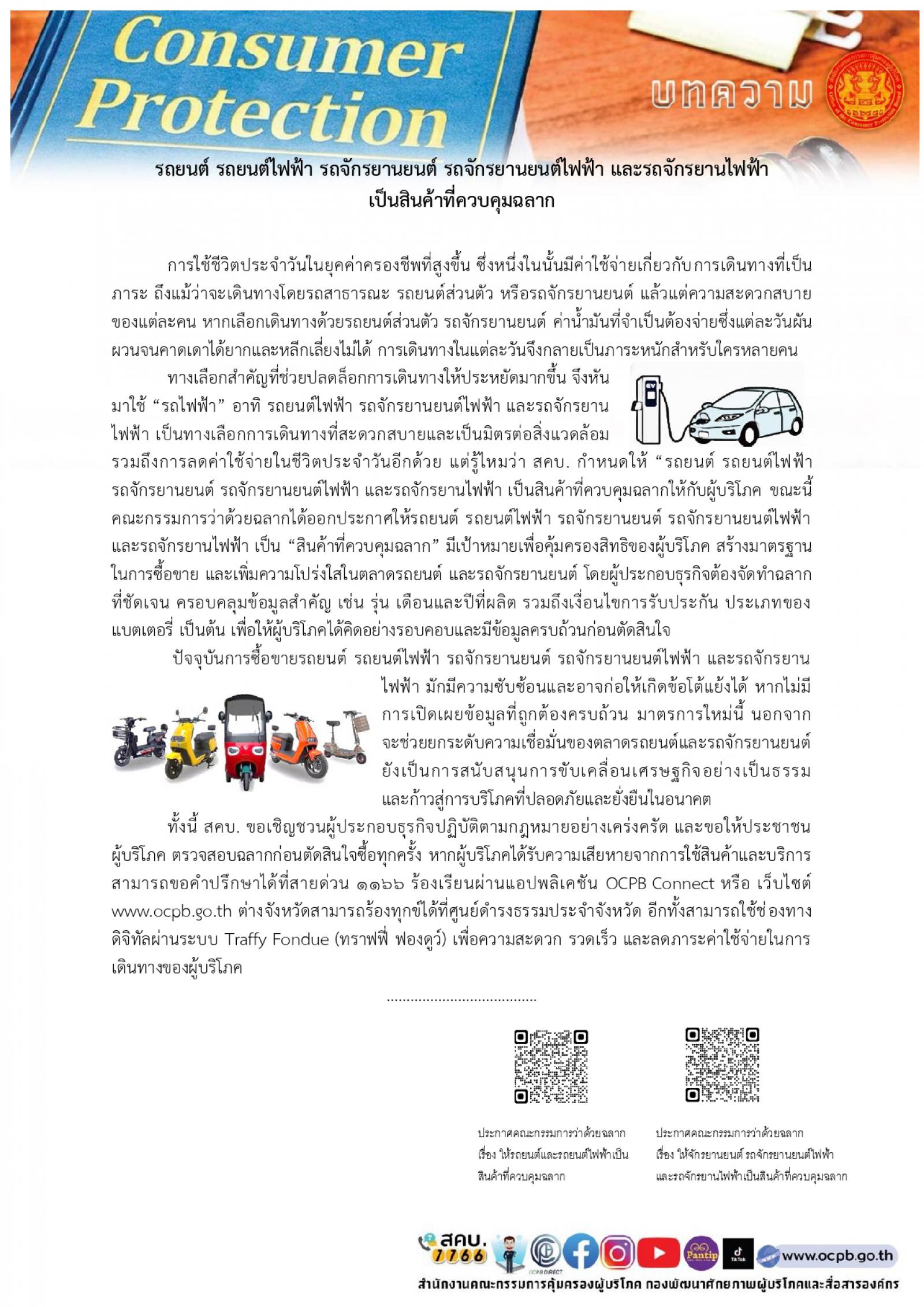 ๑) รถยนต์ รถยนต์ไฟฟ้า รถจักรยานยนต์ รถจักรยานยนต์ไฟฟ้า และรถจักรยานไฟฟ้า เป็นสินค้าที่ควบคุมฉลาก